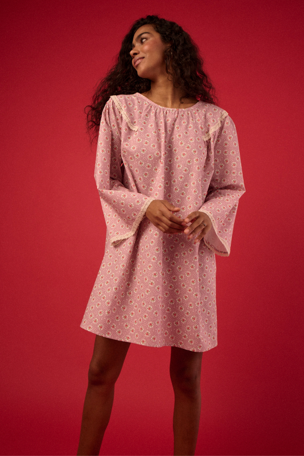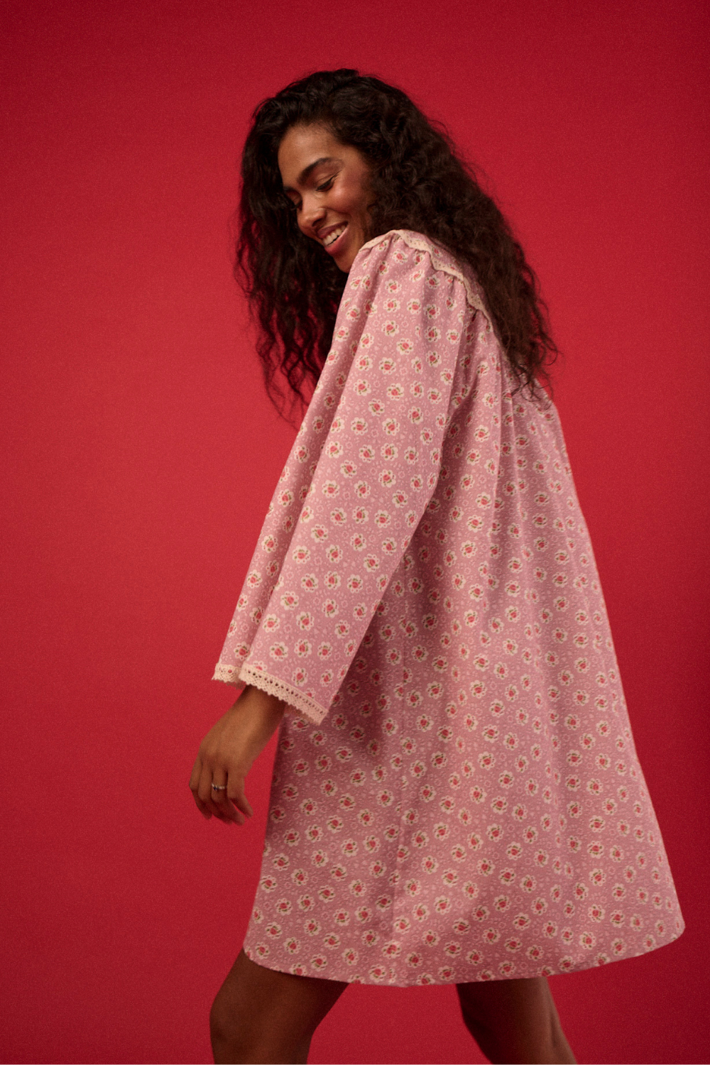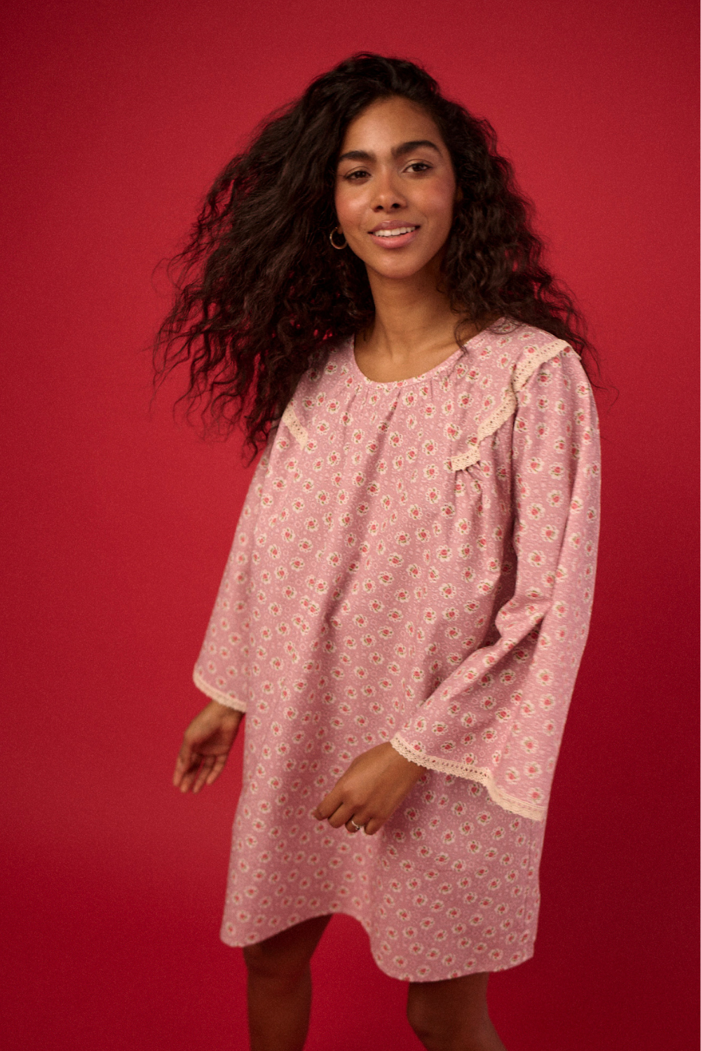 Estelle to romantyczna koszulka w stylu retro. To znacznie więcej niż koszulka do spania, to wyraz kobiecości i elegancji. Koszulka ma formę trapezu, długość przed kolano, jej charakterystycznym elementem są długie szerokie rękawy wykończone koronką. Koronka pojawia się też w formie przeszycia na plecach i ramionach. To ona w zestawieniu z tkaniną bawełnianą w print drobnych kwiatów nadaje jej charakteru retro. Koszulka uszyta z wysokiej jakości 100% tkaniny bawełnianej w delikatnym odcieniu różu, od naszego hiszpańskiego producenta tkanin. Wysokiej jakości tkanina gwarantuje niezrównany komfort snu jednocześnie dbając o Twoją skórę. To doskonały wybór dla kobiet ceniących subtelność, kobiecość, oraz komfort i romantyzm w chwilach relaksu i odpoczynku.