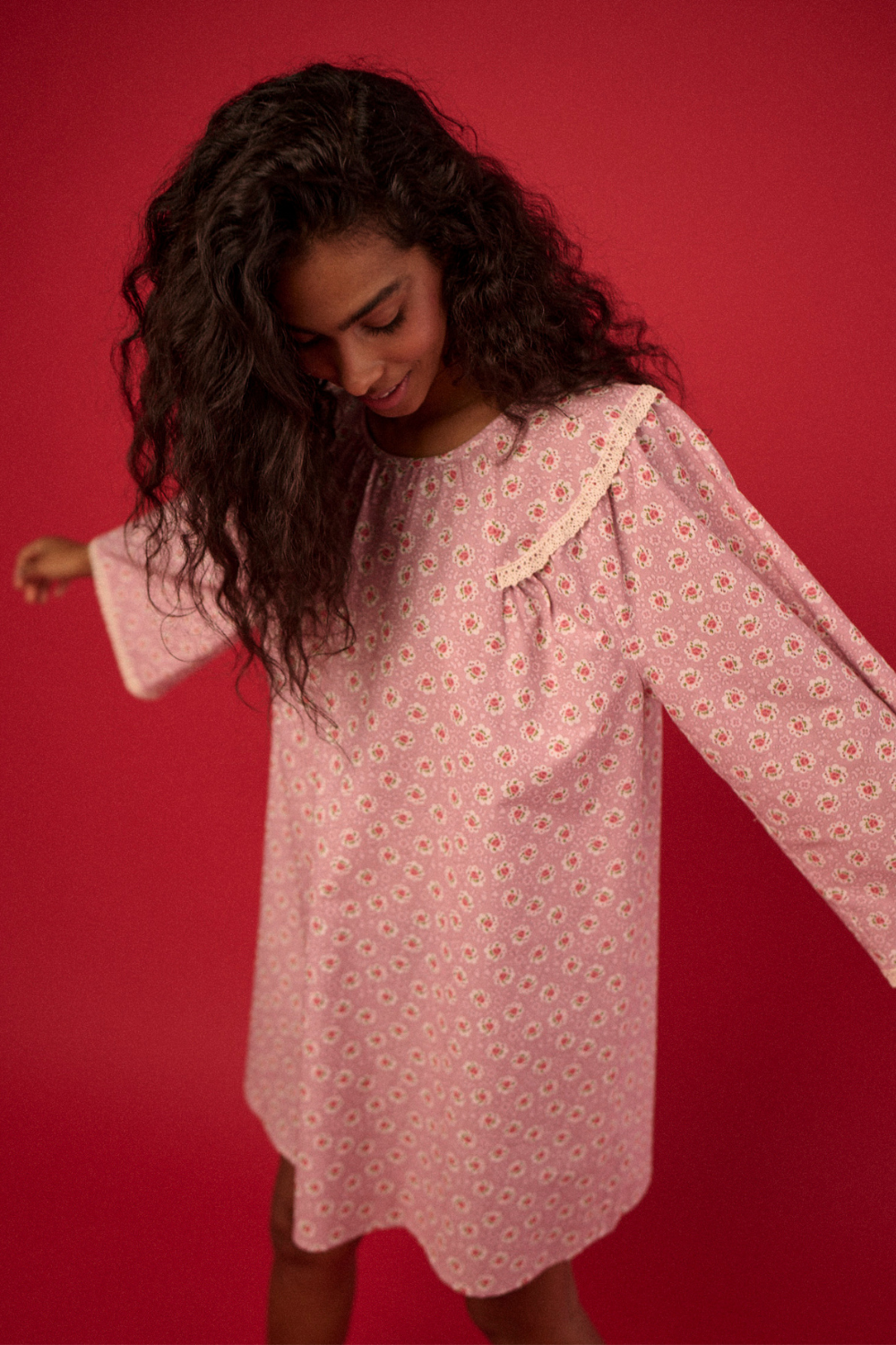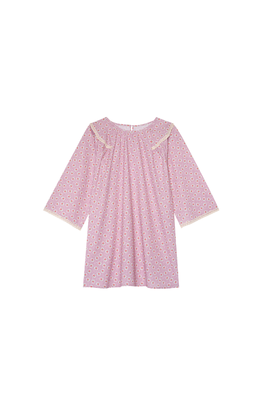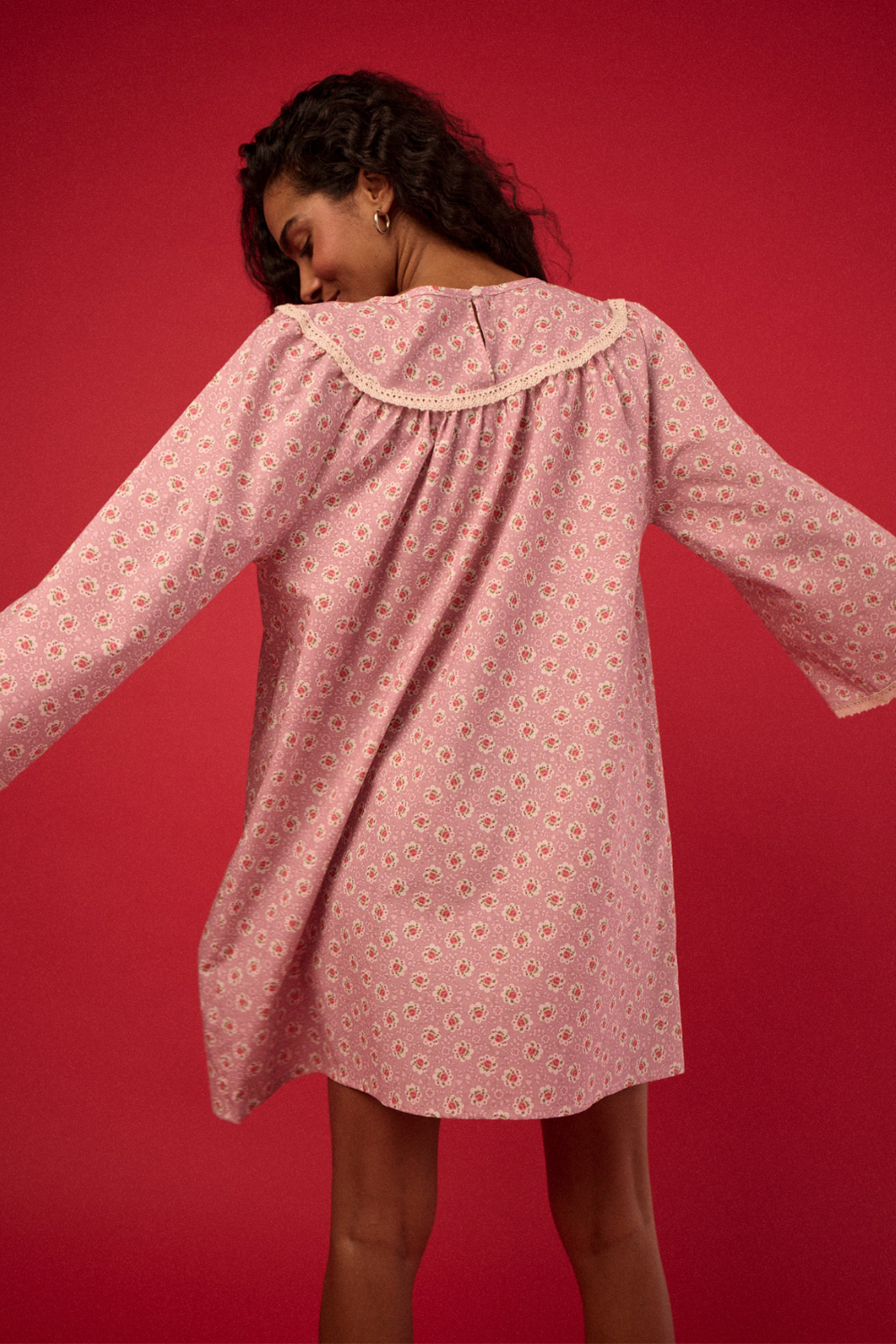 Estelle to romantyczna koszulka w stylu retro. To znacznie więcej niż koszulka do spania, to wyraz kobiecości i elegancji. Koszulka ma formę trapezu, długość przed kolano, jej charakterystycznym elementem są długie szerokie rękawy wykończone koronką. Koronka pojawia się też w formie przeszycia na plecach i ramionach. To ona w zestawieniu z tkaniną bawełnianą w print drobnych kwiatów nadaje jej charakteru retro. Koszulka uszyta z wysokiej jakości 100% tkaniny bawełnianej w delikatnym odcieniu różu, od naszego hiszpańskiego producenta tkanin. Wysokiej jakości tkanina gwarantuje niezrównany komfort snu jednocześnie dbając o Twoją skórę. To doskonały wybór dla kobiet ceniących subtelność, kobiecość, oraz komfort i romantyzm w chwilach relaksu i odpoczynku.