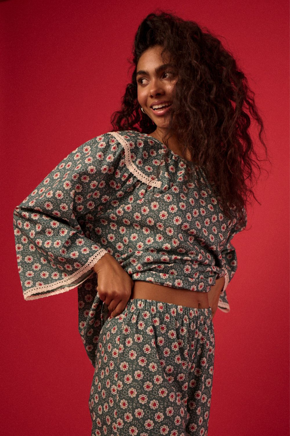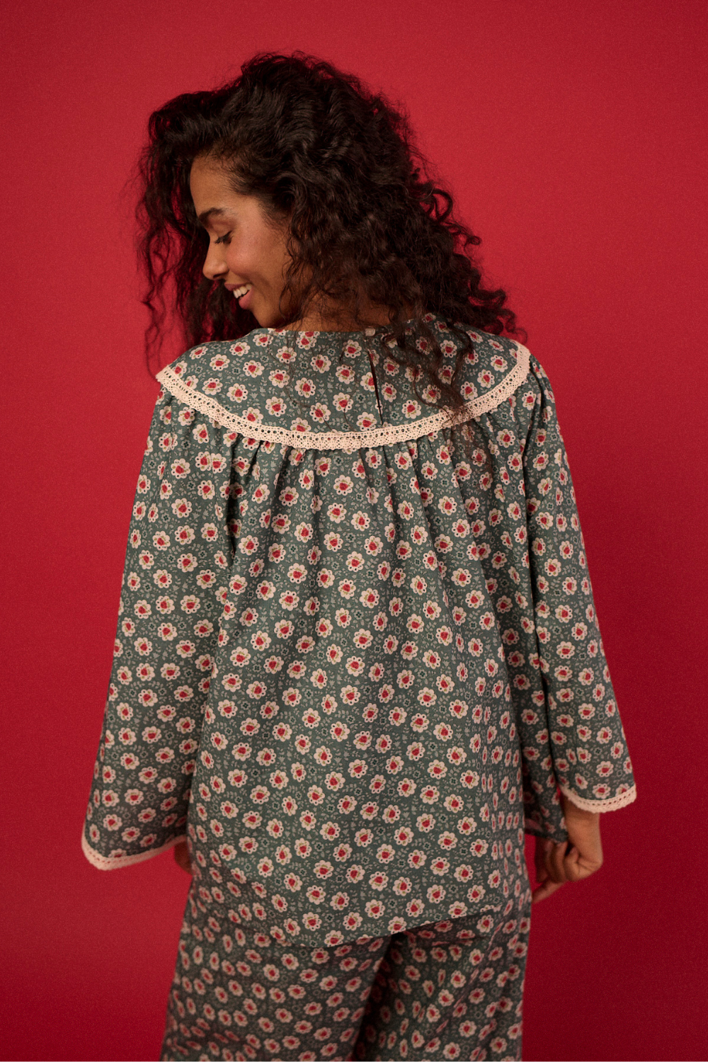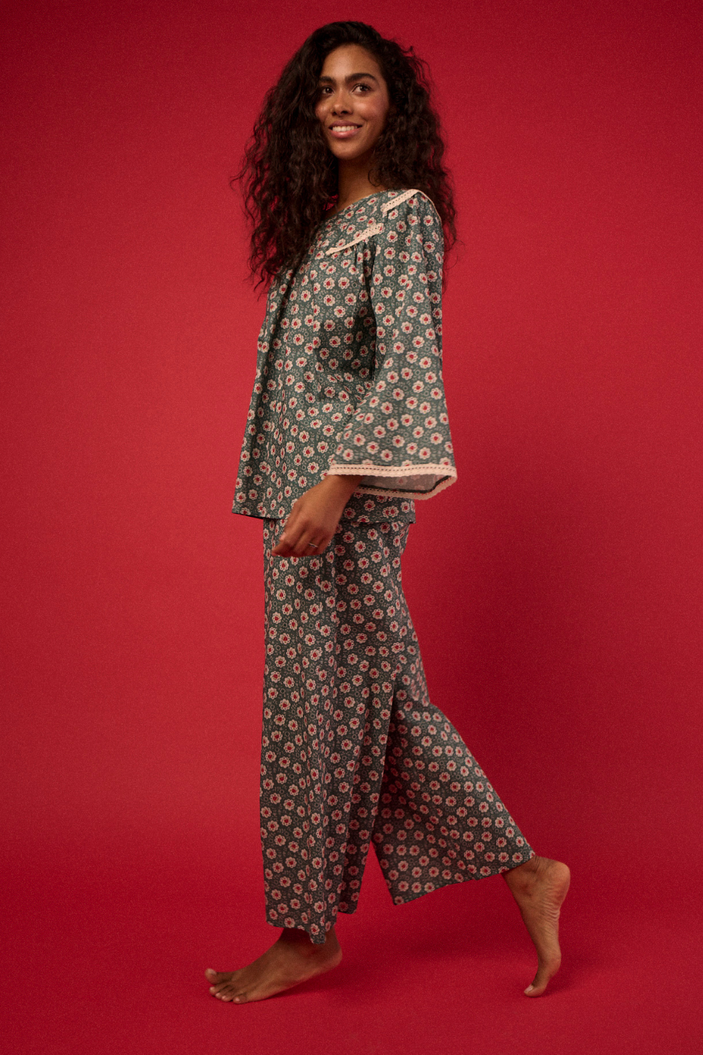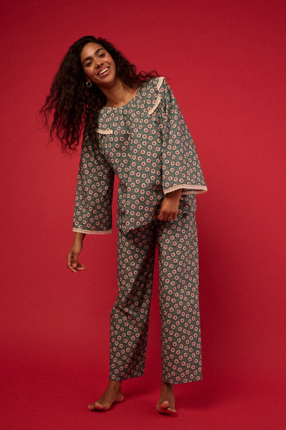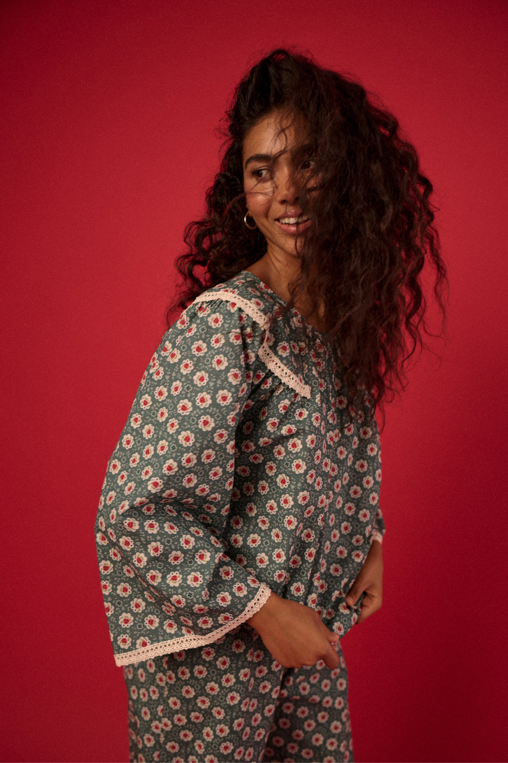 Odette to romantyczny set w stylu retro. To znacznie więcej niż piżama do spania, to wyraz kobiecości i elegancji. Odette składa się z szerokich, komfortowych spodni oraz koszulki z charakterystycznymi szerokimi rękawami wykończonymi koronką. Koronka pojawia się też w formie przeszycia na plecach i ramionach. To ona w zestawieniu z tkaniną bawełnianą w print drobnych kwiatów nadaje jej charakteru retro. Całość uszyta z wysokiej jakości 100% tkaniny bawełnianej w pięknym odcieniu zieleni, od naszego hiszpańskiego producenta tkanin. Wysokiej jakości tkanina gwarantuje niezrównany komfort snu jednocześnie dbając o Twoją skórę. To doskonały wybór dla kobiet ceniących subtelność, kobiecość, oraz komfort i romantyzm w chwilach relaksu i odpoczynku.