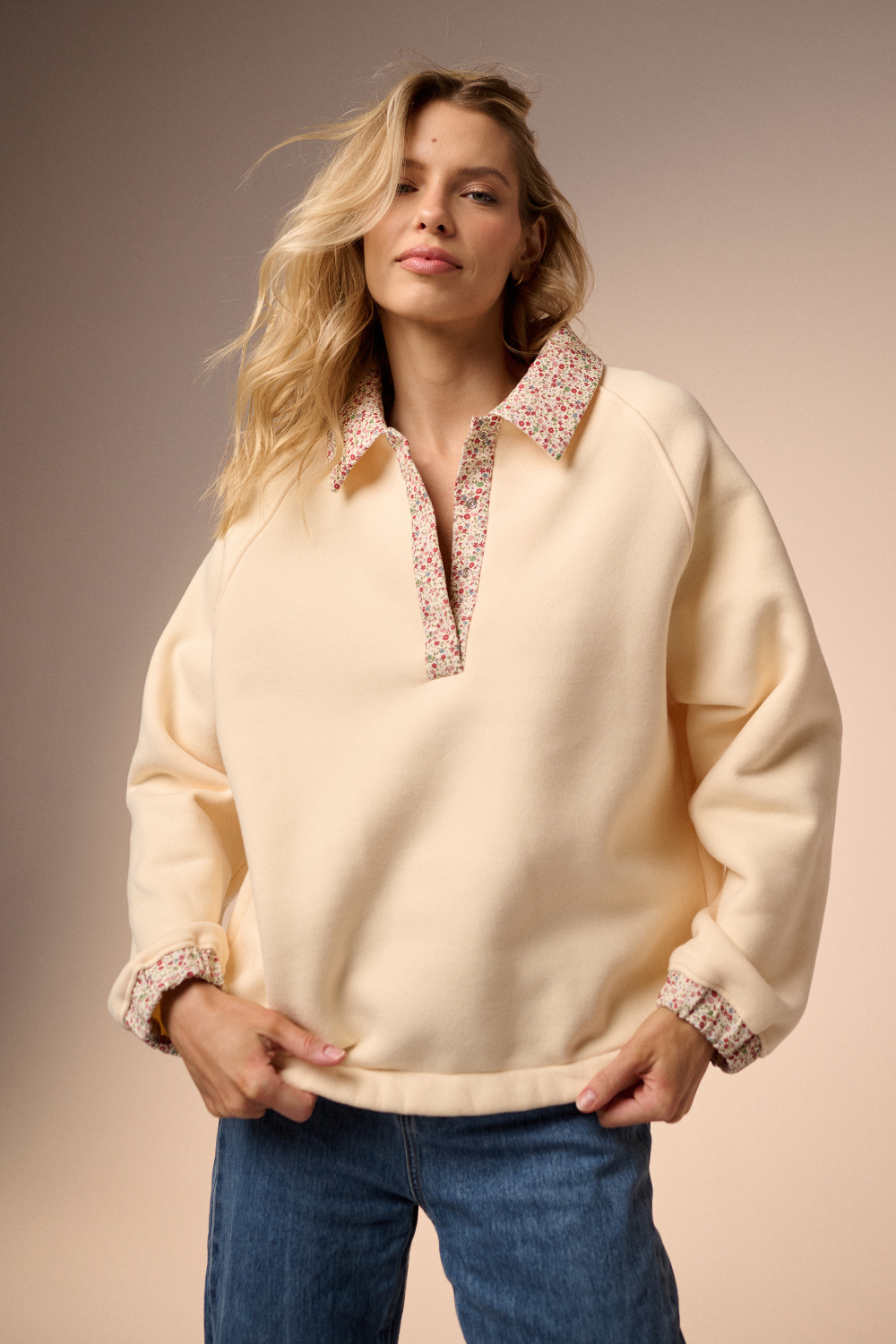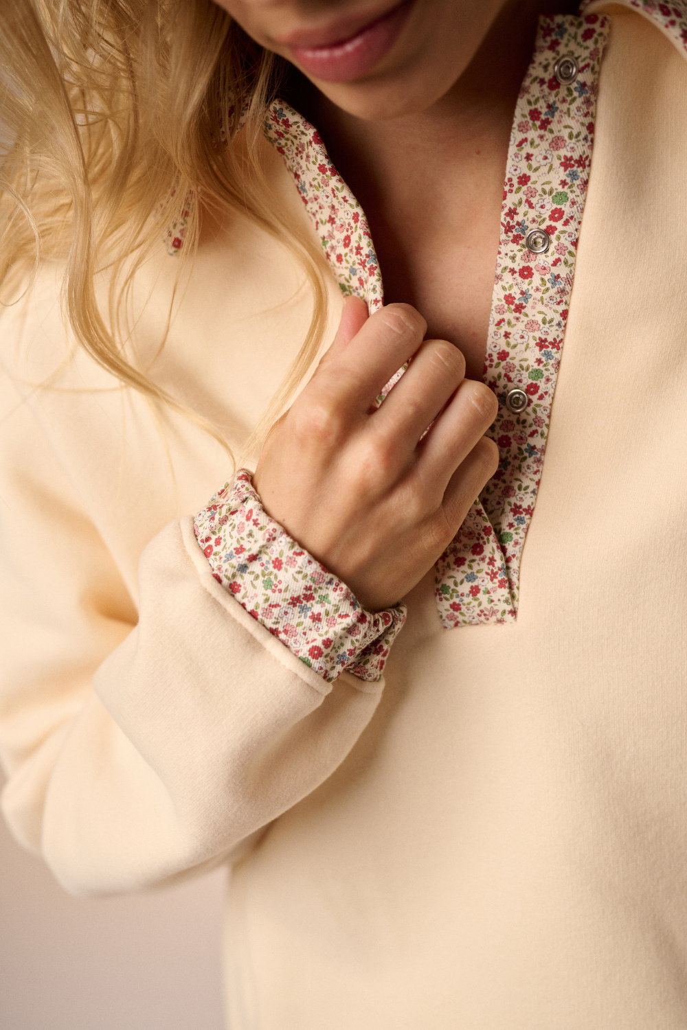 Zaprojektowana i uszyta w Polsce z myślą o codziennym komforcie, który zostaje z Tobą na długo. Ta bluza powstała z wysokogatunkowej bawełnianej dzianiny o gramaturze 320 g, z wykończeniem skin peach oraz miękką, drapaną dresówką typu „miś” od wewnątrz. Już przy pierwszym założeniu daje natychmiastowe uczucie ciepła i przyjemnego otulenia. Klasyczny krój polo z kołnierzem wykończonym bawełnianą tkaniną w drobne kwiatki nadaje jej subtelnego, unikalnego charakteru. To detal, który przełamuje sportową formę i dodaje kobiecej lekkości. Ponadczasowy fason polo sprawia, że to model na lata — odporny na zmieniające się trendy, zawsze aktualny. Materiał posiada certyfikat Oeko-Tex® Standard 100, co oznacza bezpieczeństwo dla skóry i najwyższą jakość wykonania. To bluza stworzona po to, by służyć długo — trwała, niezawodnie komfortowa i dopracowana w każdym detalu. Idealna w zestawie z ulubionymi jeansami. Na chłodne poranki, długie spacery i spokojne wieczory. Otula. Grzeje. Zostaje z Tobą na lata.