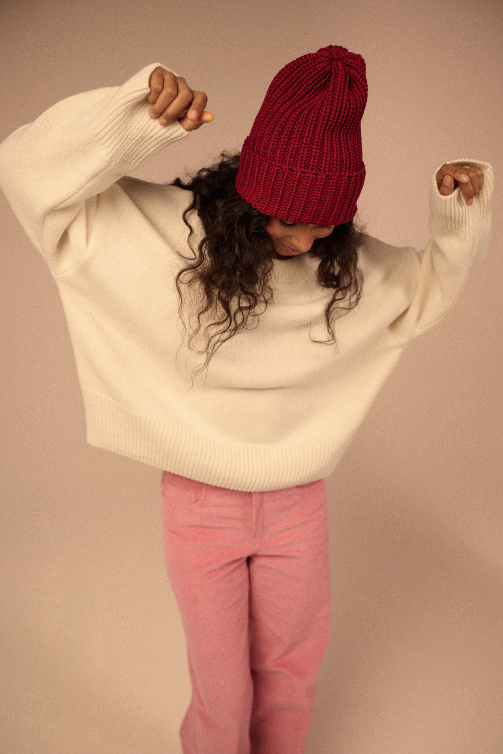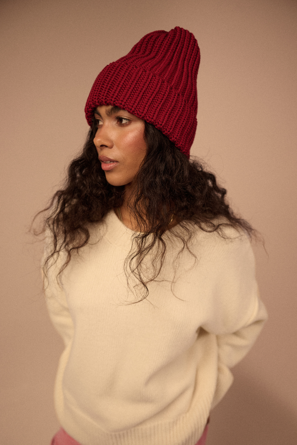 Otulająca czapka uszyta z miękkiej wełny extrafine merino wool w dwóch wyjątkowych kolorach ocean oraz berry.