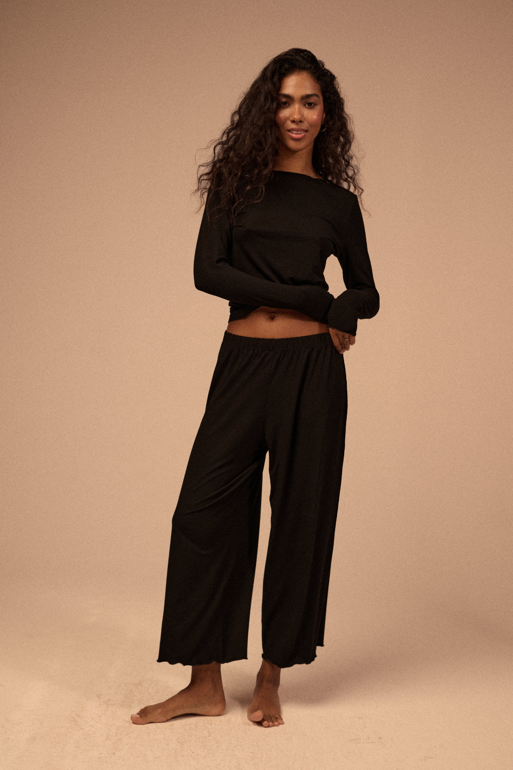 Szalenie wygodny zestaw so comfy składa się z longsleev'a wykończonego mereżką w kolorze czarnym oraz szerokich spodni typu culotte. Zestaw wykonany z miękkiej wiskozy bambusowej, która pięknie otula kobiecą figurę. Wyjątkowy zestaw, nie tylko do spania w klasycznym czarnym kolorze.