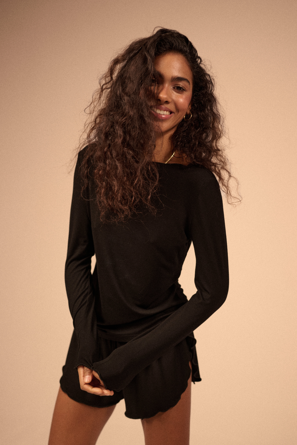 Szalenie wygodny zestaw so comfy składa się z longsleev'a wykończonego mereżką w kolorze dzianiny oraz kobiecych szortów z rozcięciem na biodrach, które subtelnie eksponuje kobiece nogi. Zestaw wykonany z miękkiej, ekologicznej wiskozy bambusowej, która pięknie otula kobiecą figurę. Wyjątkowy zestaw, nie tylko do spania.