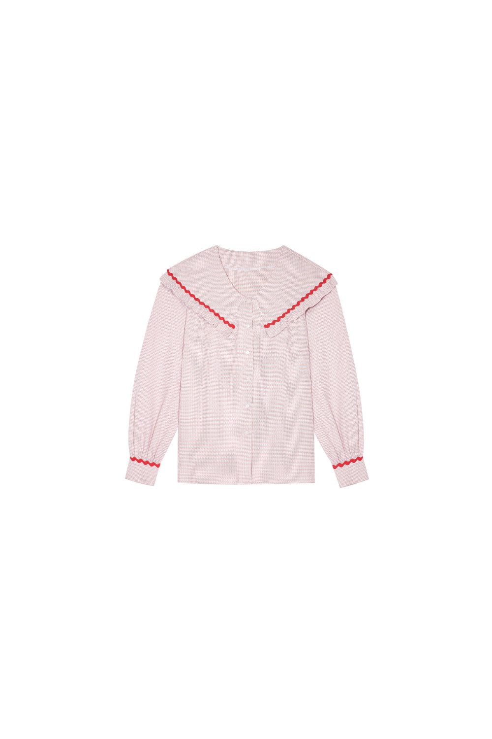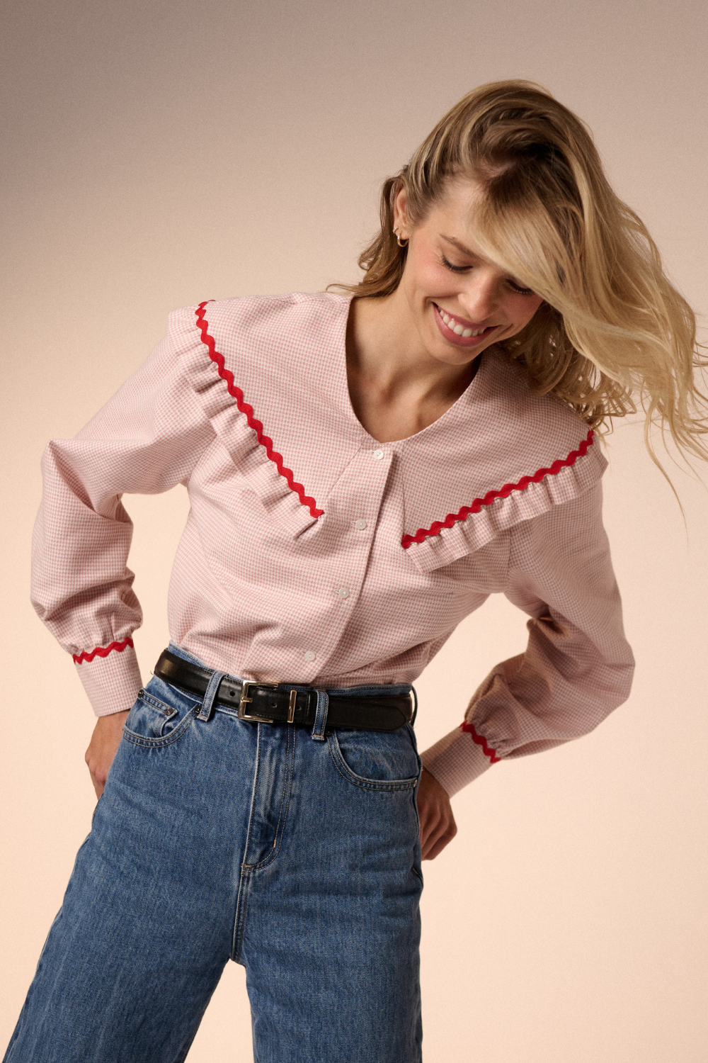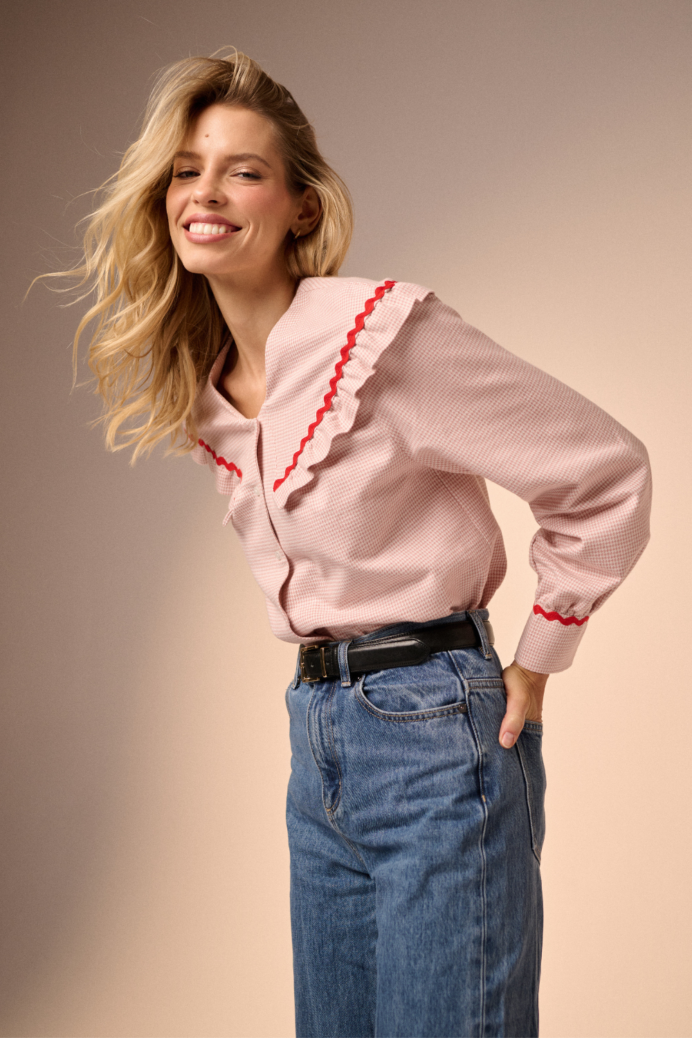 Nowa odsłona bestsellerowej koszuli Eleonora, tym razem w wyjątkowym odcieniu baby pink. Rozpinana, we wzór pepitki, z rękawami wykończonymi mankietami i wyjątkowym kołnierzem, który jest już naszym znakiem rozpoznawczym. Koszula Eleonora zachwyca stylem, klasą i zachowaną równowagą pomiędzy oryginalnością i ponadczasową formą. Tym razem kołnierz wykończyłyśmy kontrastową falistą taśmą w czerwonym kolorze, która pięknie podkreśla charakter koszuli. Dzięki jakości materiału o wysokiej gramaturze 255, oraz ponadczasowej formie, produkt stworzony z myślą o długim użytkowaniu.