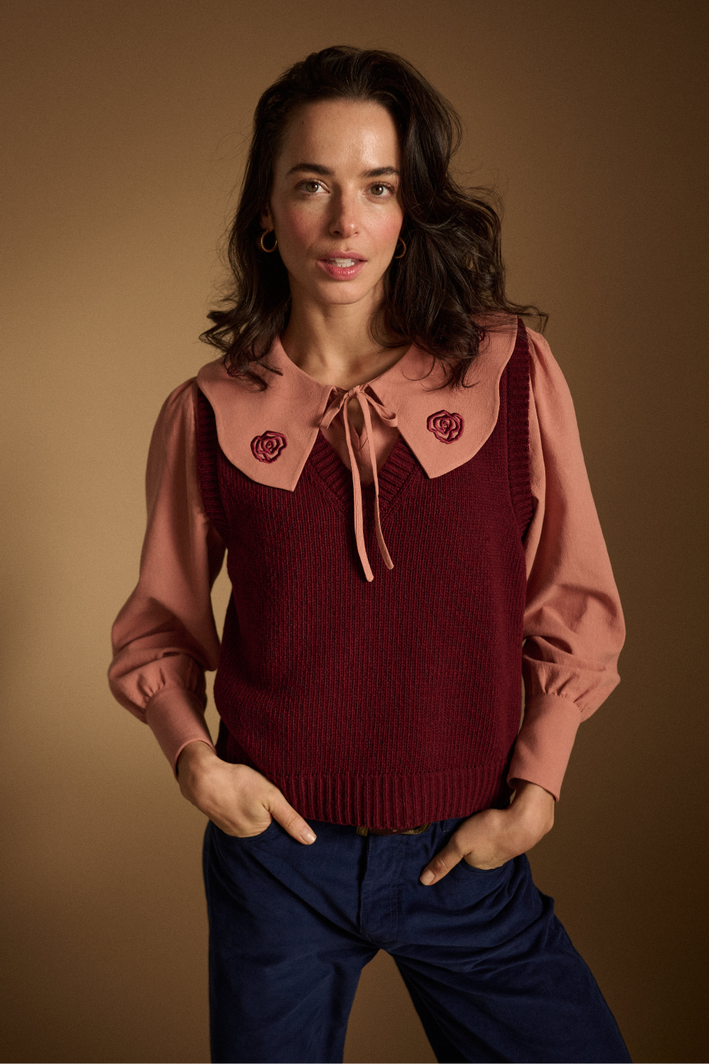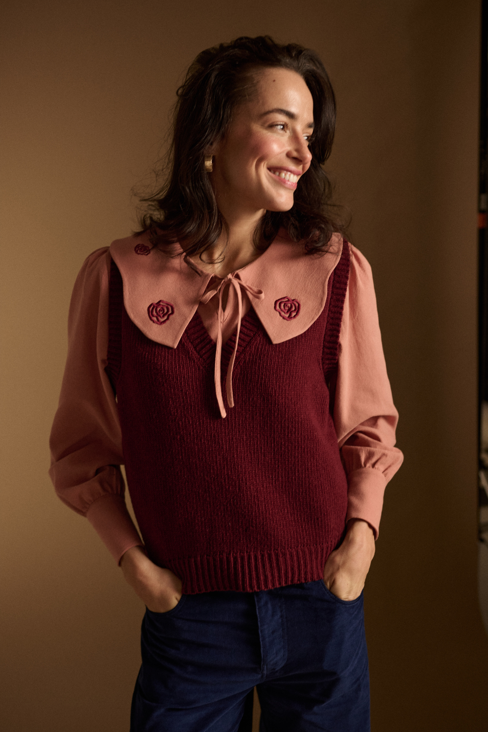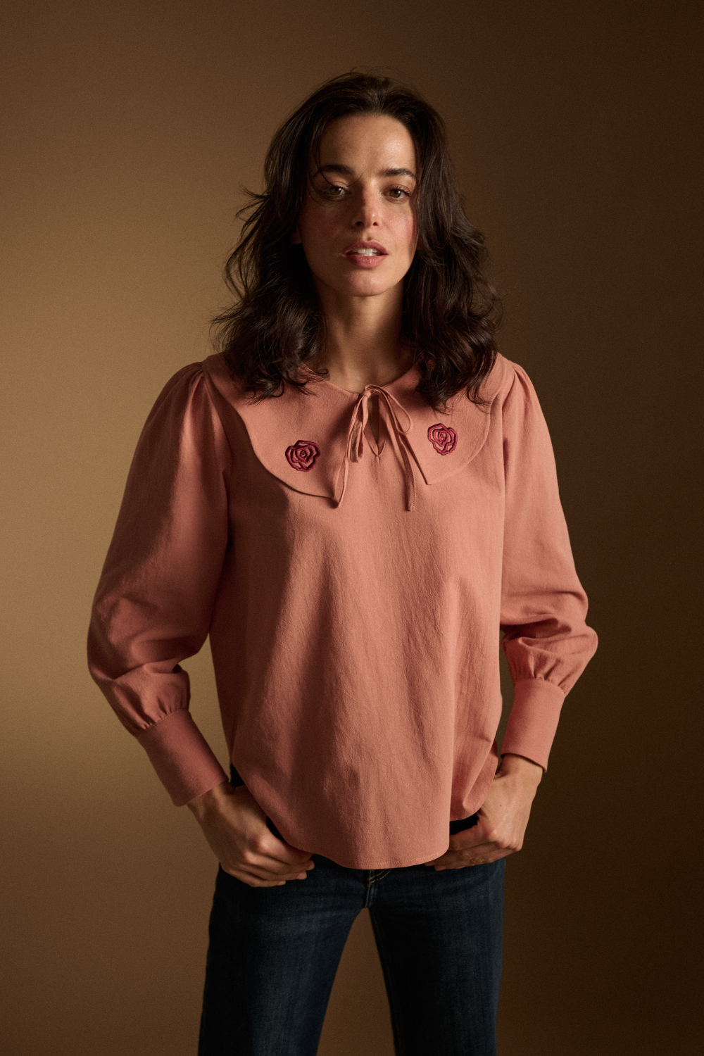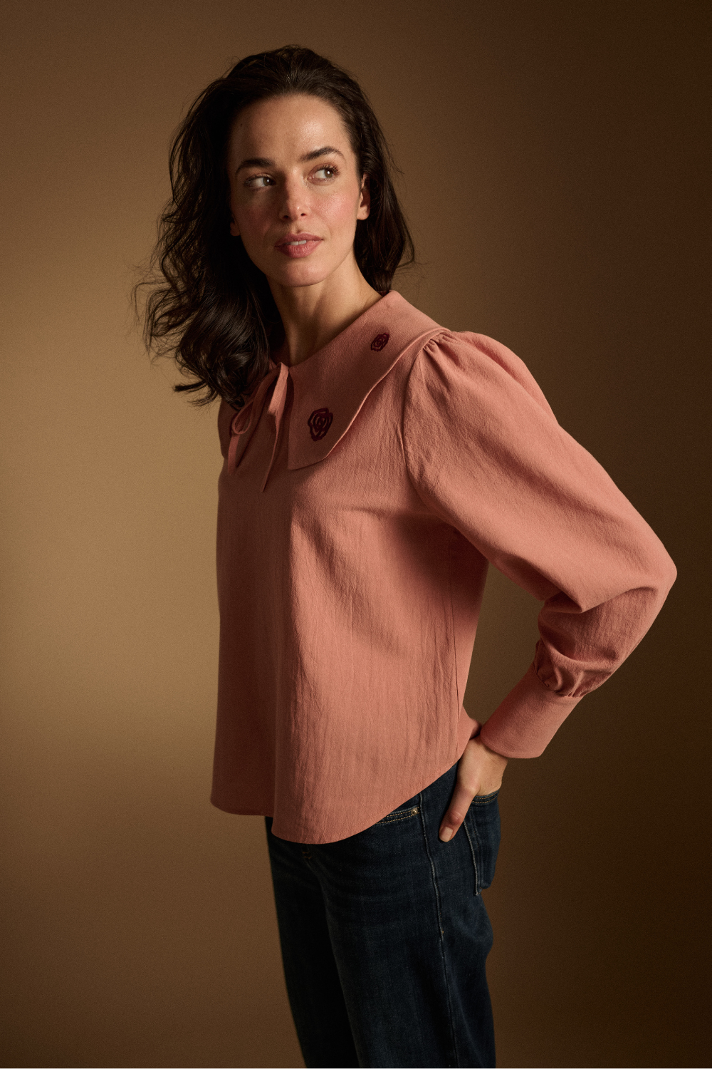 Koszula Rosalie to ukłon w stronę romantycznej klasyki. Uszyta w Polsce z hiszpańskiej, certyfikowanej bawełny Oeko-Tex®, zachwyca obszernym kołnierzem z haftem drobnych bordowych róż i szerokimi mankietami. Noś z ulubionymi jeansami lub sztruksami Harper, solo lub z kamizelką La Boheme — zawsze z lekkością i kobiecym wdziękiem, w duchu sleepless in Warsaw.