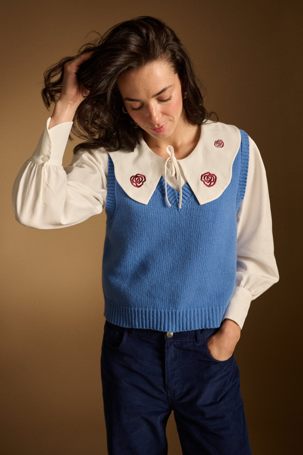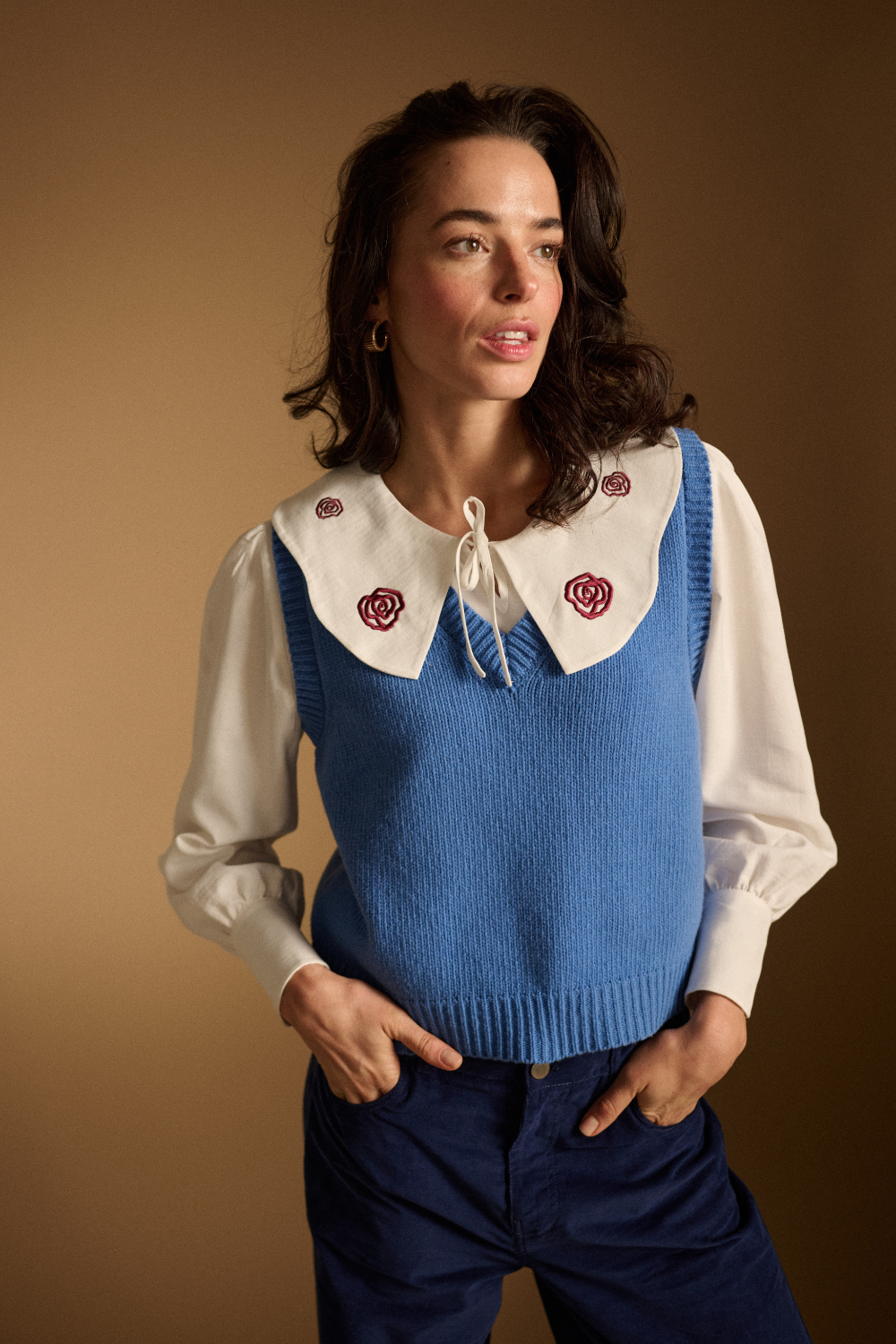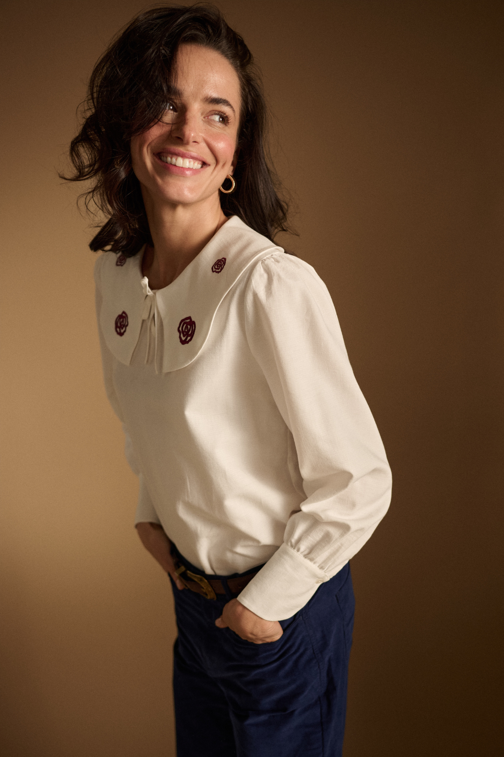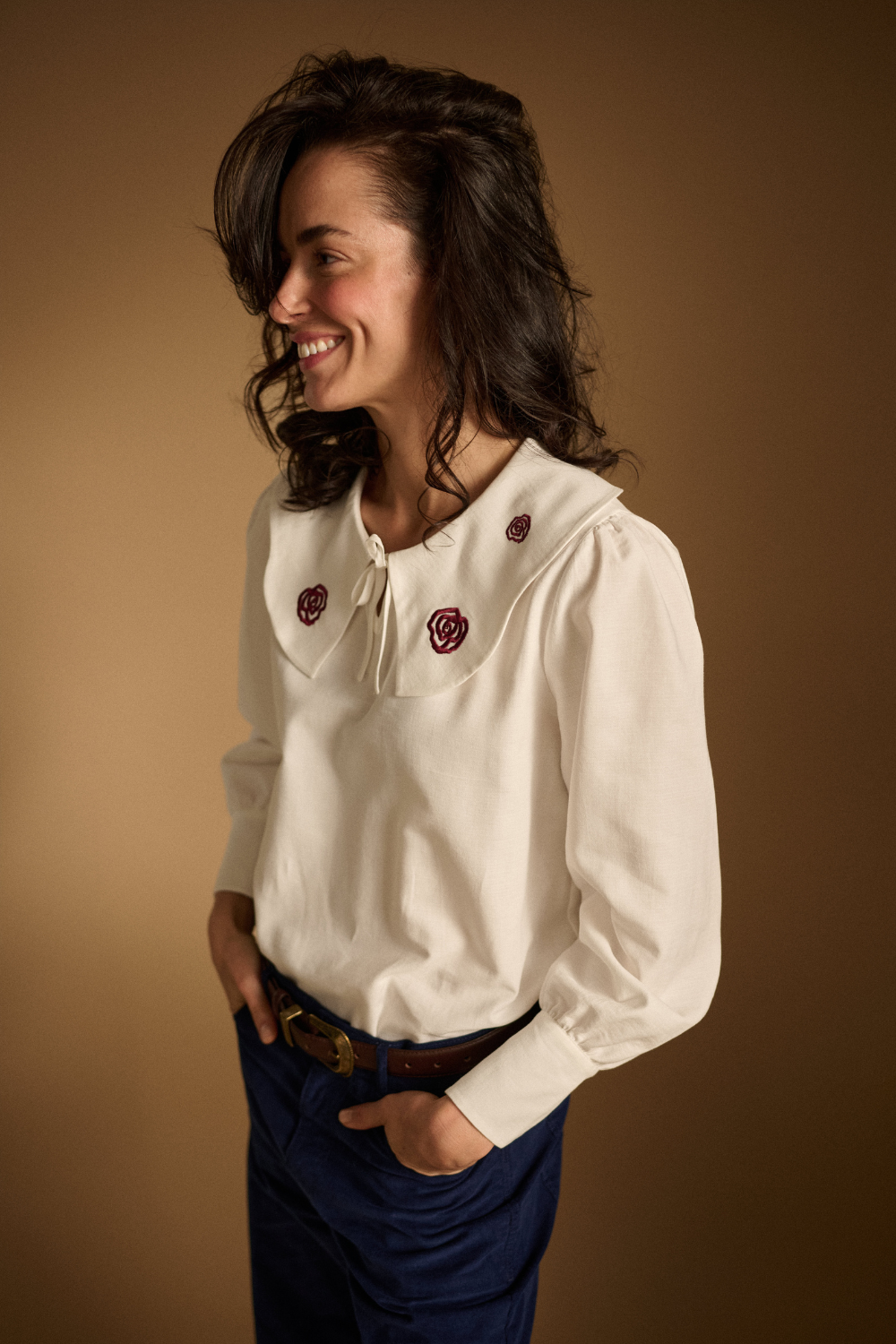 Koszula Rosalie to ukłon w stronę romantycznej klasyki. Uszyta w Polsce z hiszpańskiej, certyfikowanej bawełny Oeko-Tex®, zachwyca obszernym kołnierzem z haftem drobnych bordowych róż i szerokimi mankietami. Noś z ulubionymi jeansami lub sztruksami Harper, solo lub z kamizelką La Boheme — zawsze z lekkością i kobiecym wdziękiem, w duchu sleepless in Warsaw.