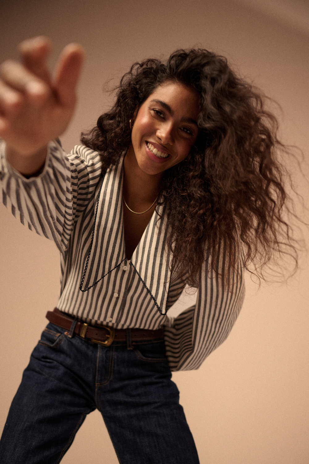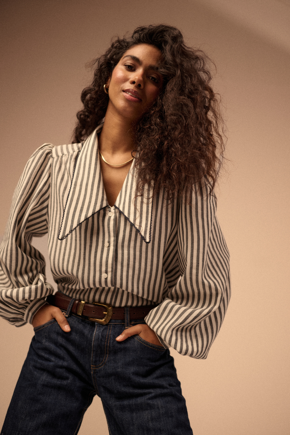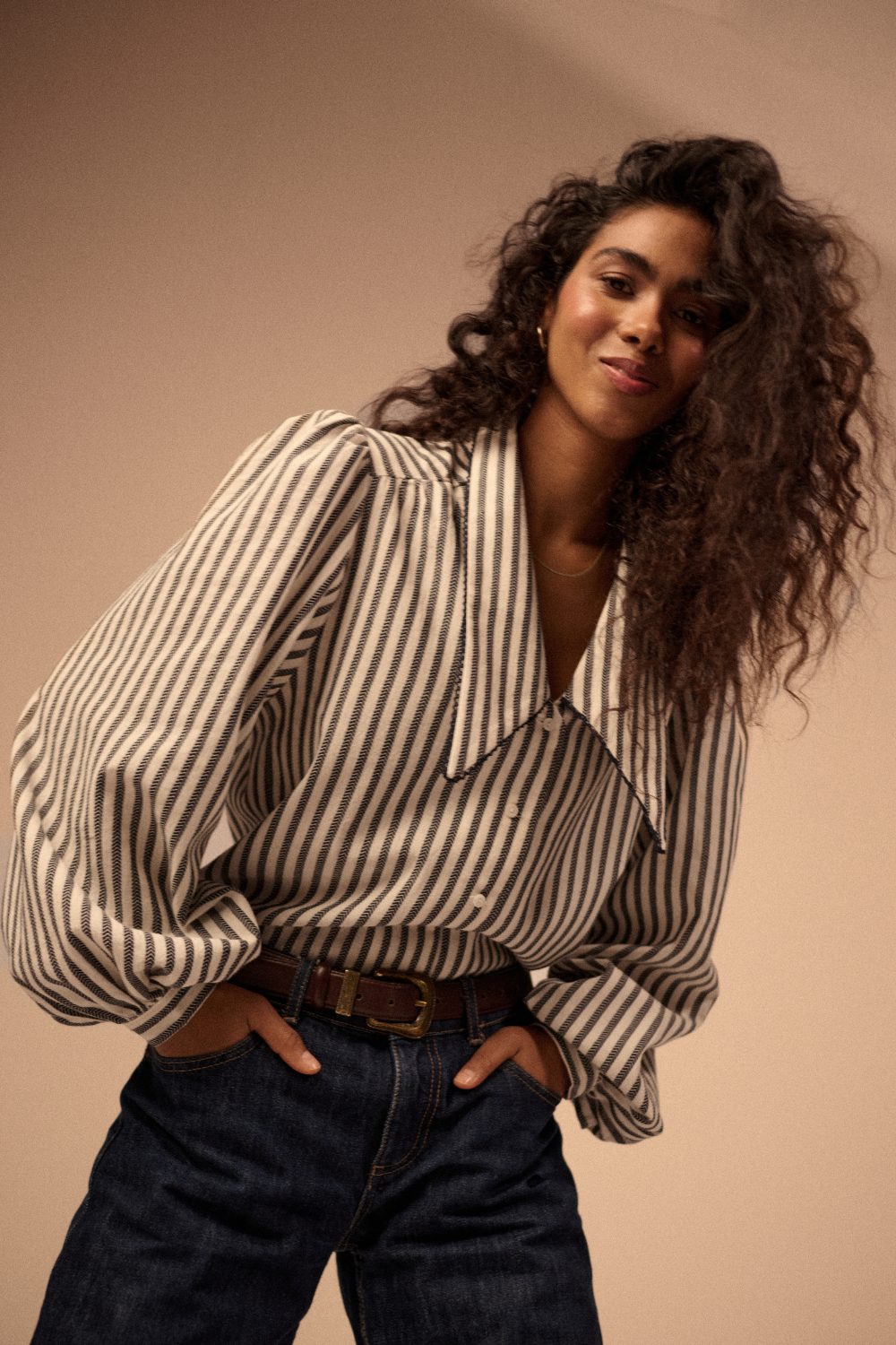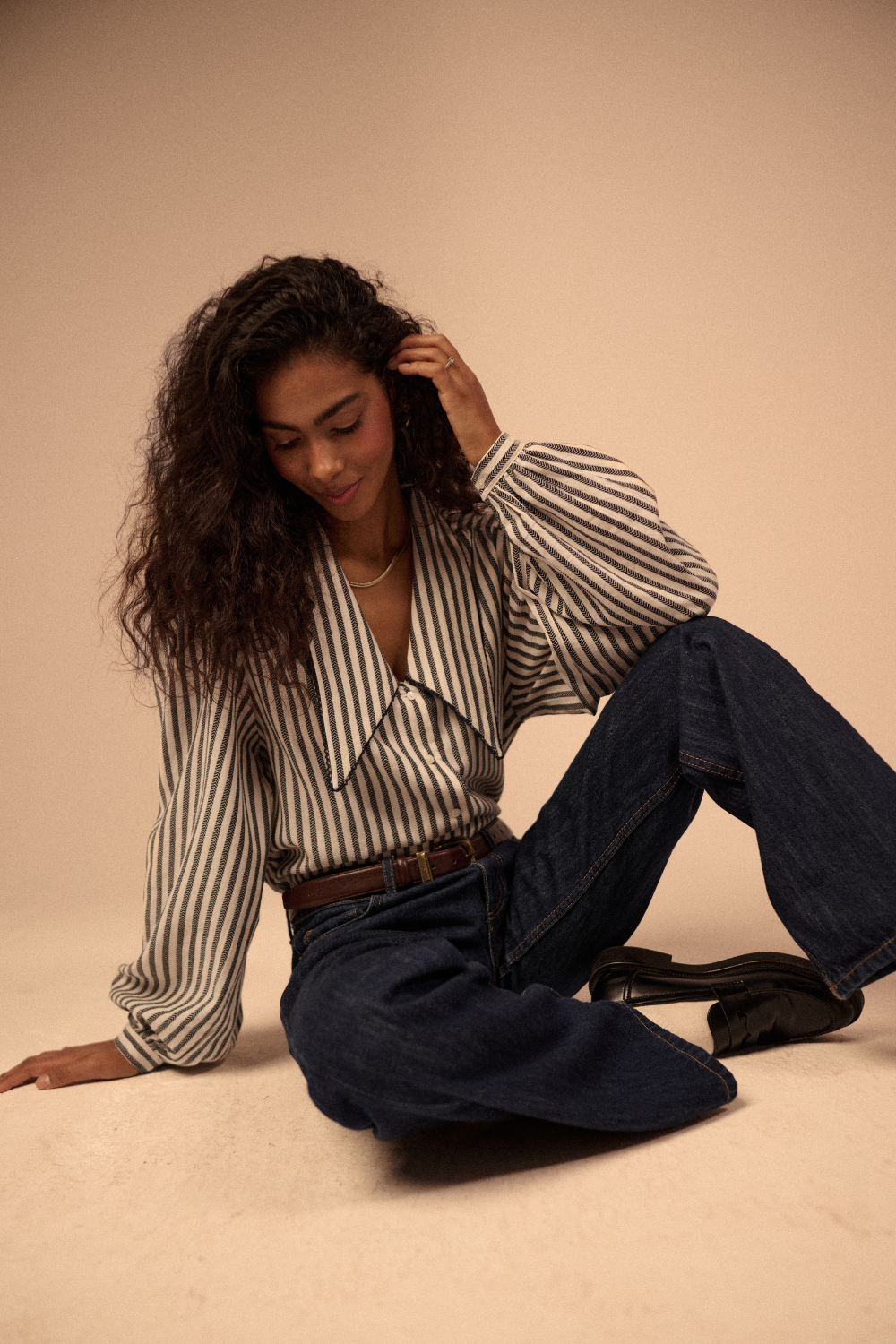 Poznajcie nową wersję kolorystyczną koszuli Stephanie. Obszerny krój, bufiaste rękawy i ten kołnierz, który zdominował trendy w modzie. Do tego dołożyłyśmy wysoko gatunkową bawełnianą tkaninę w klasyczne pasy oraz wykończenie hiszpańską koronką. Tutaj nic się nie zmieniło. Zmieniła się natomiast kolorystyka. Szlachetny granat nadaje elegancji i czyni jeszcze bardziej uniwersalną. Noś do jeansów w każdym fasonie i kolorze. Dobrze wyczułyśmy, że to będzie hit tego sezonu. Jej poprzednia wersja wyprzedała się w 24 godziny.