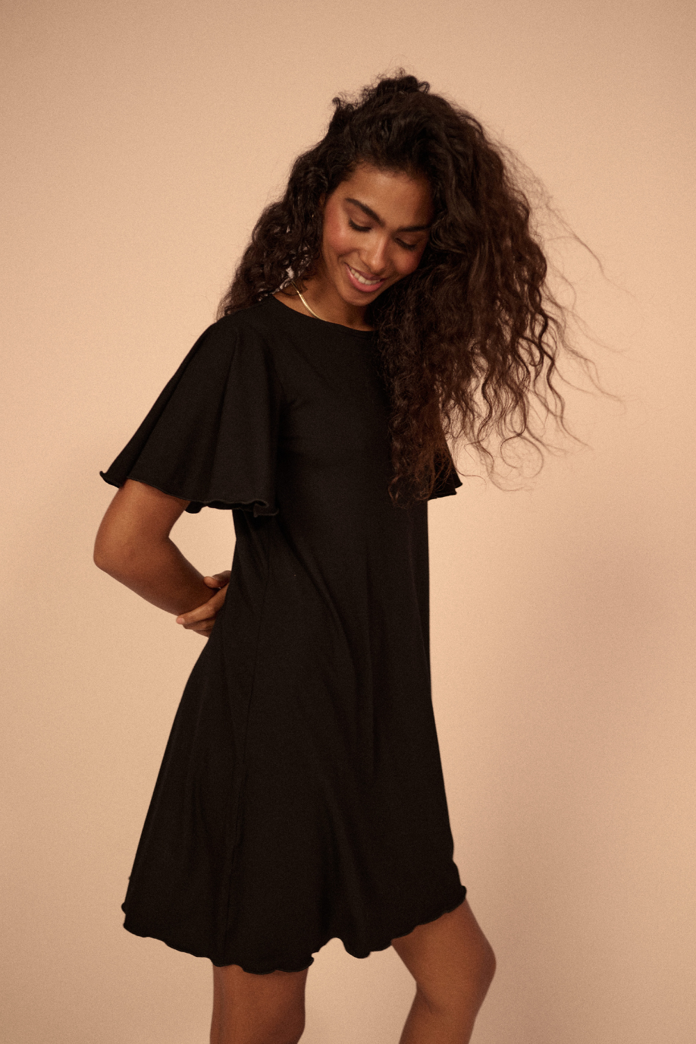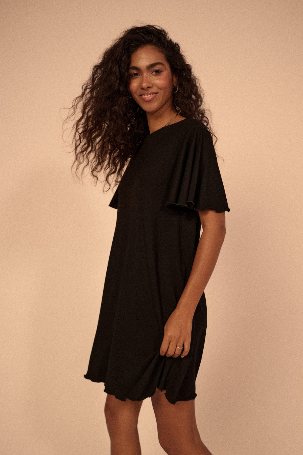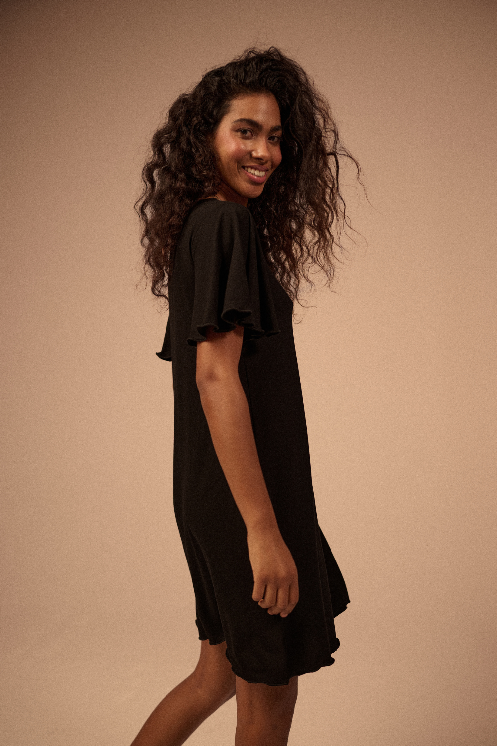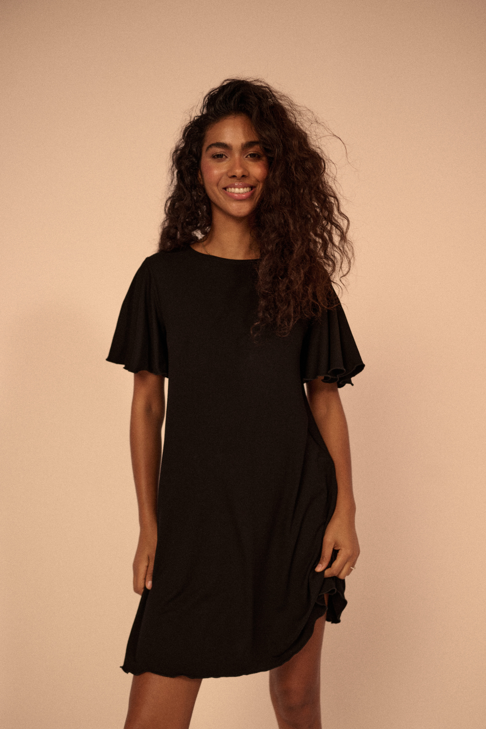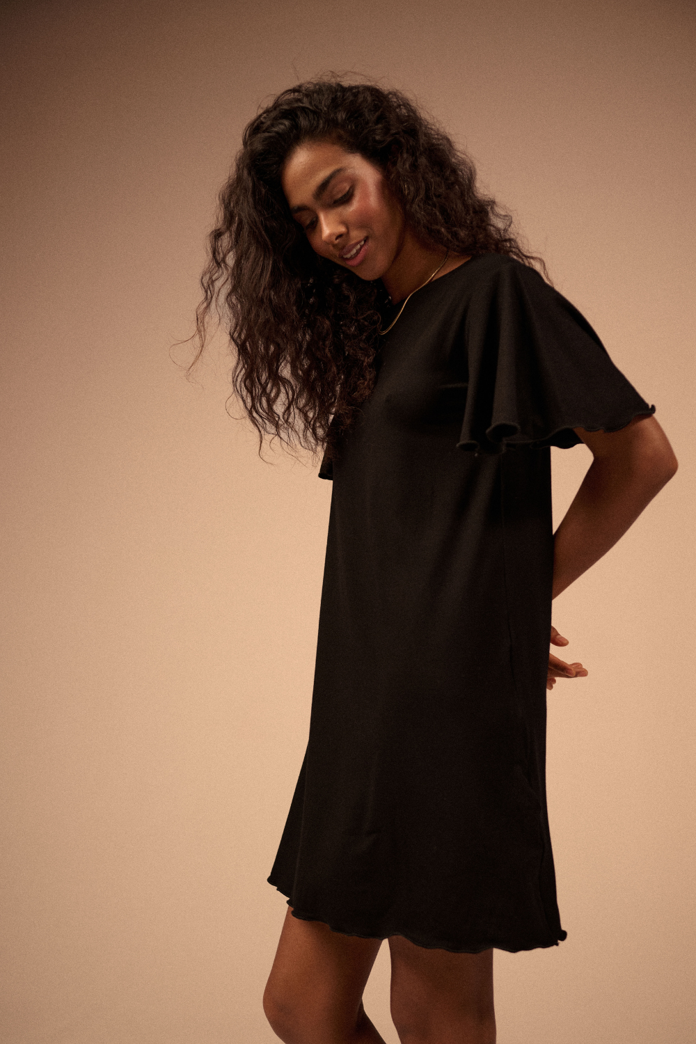 Zwiewna, dziewczęca, koszulka nocna z bufiastym, krótkim rękawem, uszyta z miękkiej wiskozy bambusowej. Całość wykończona mereżką w klasycznej eleganckiej czerni.