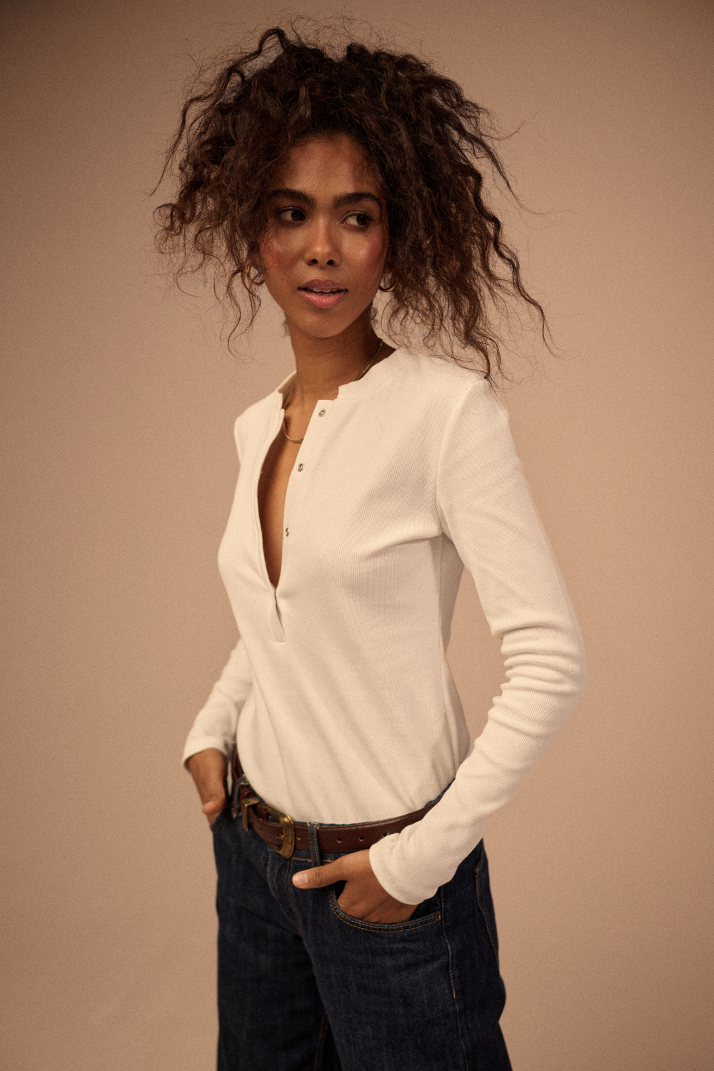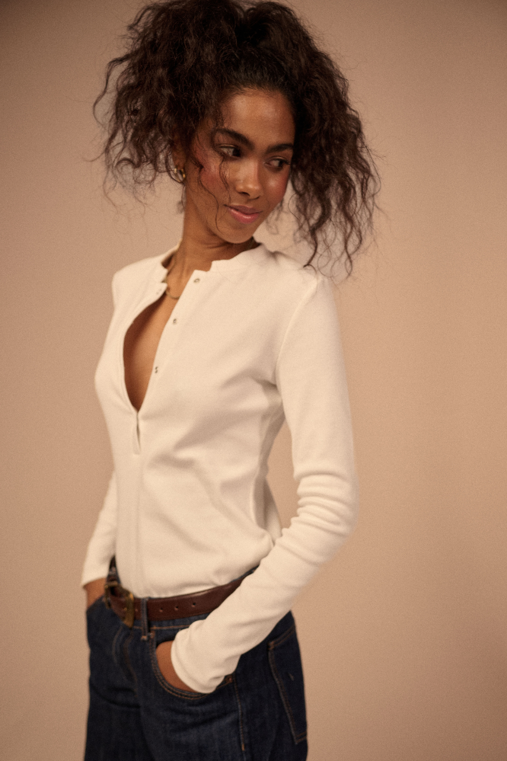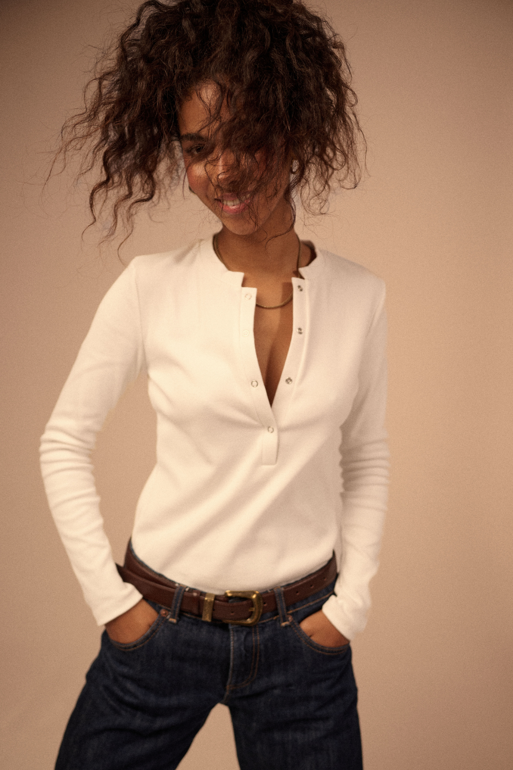 Klasyczny, biały, perfekcyjny w swojej prostocie. Uszyty z wysokogatunkowej bawełny, która świetnie pracuje na sylwetce i zachowuje formę nawet po wielu praniach. Dekolt z głębszym rozcięciem zapinanym na zatrzaski dodaje mu kobiecości — możesz nosić go na dwa sposoby: całkowicie zapięty, bardziej minimalistyczny, albo lekko rozpięty, swobodniejszy, bardziej nonszalancki