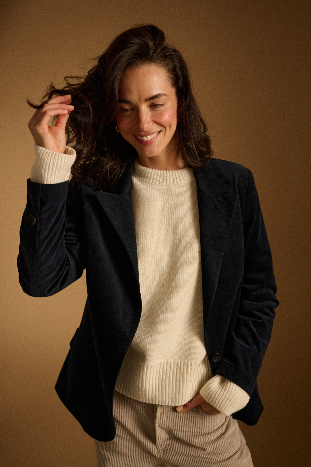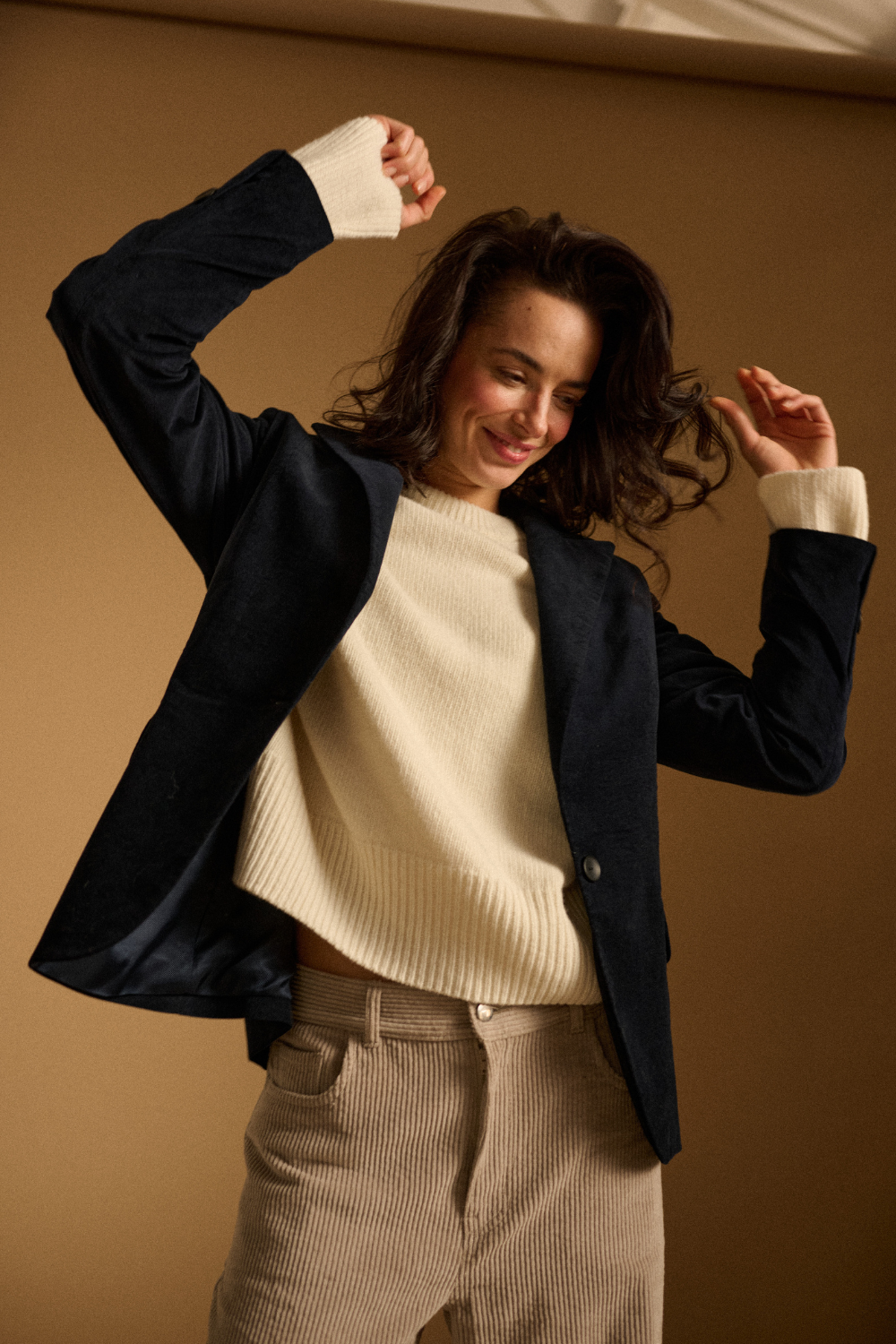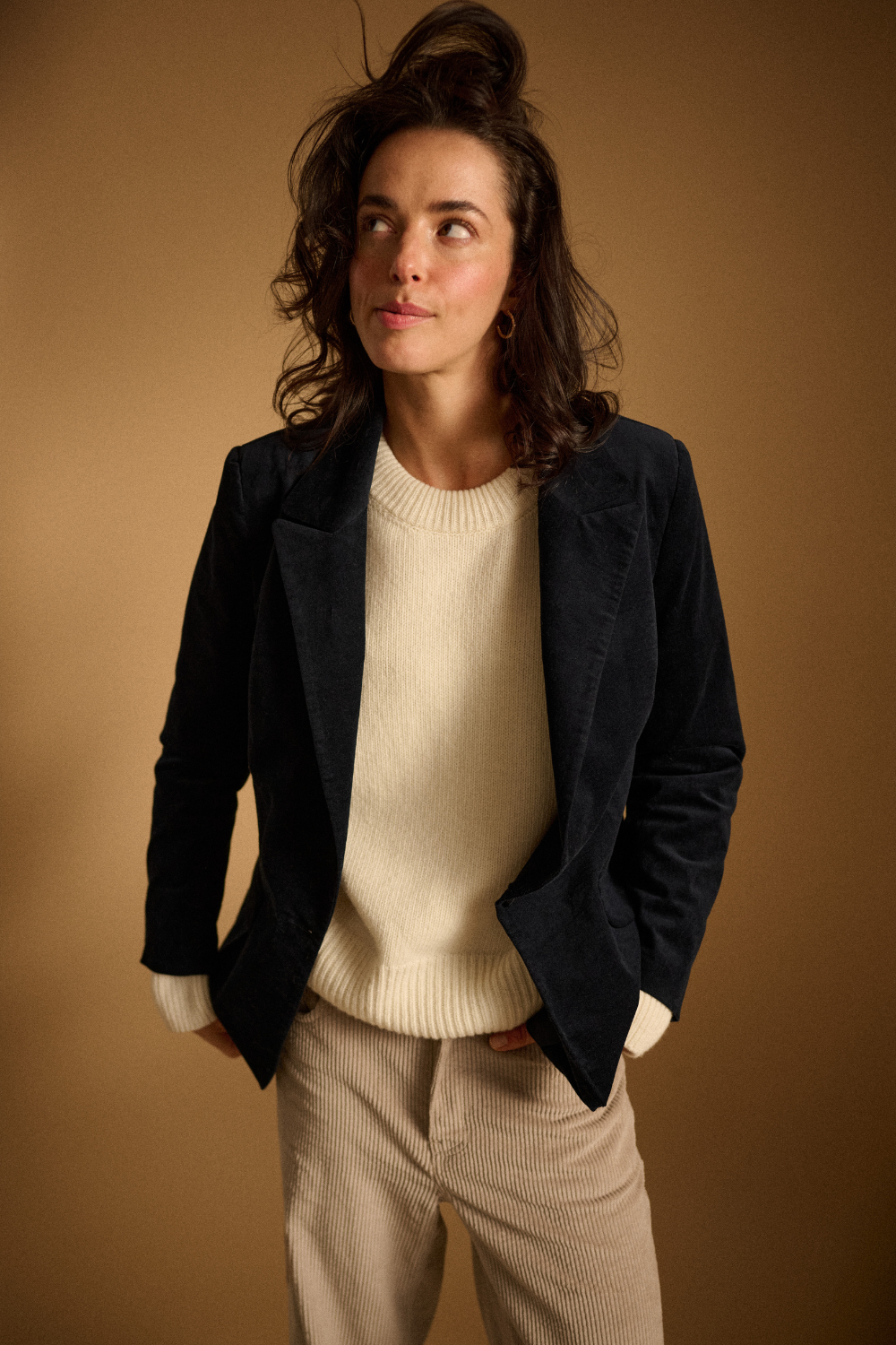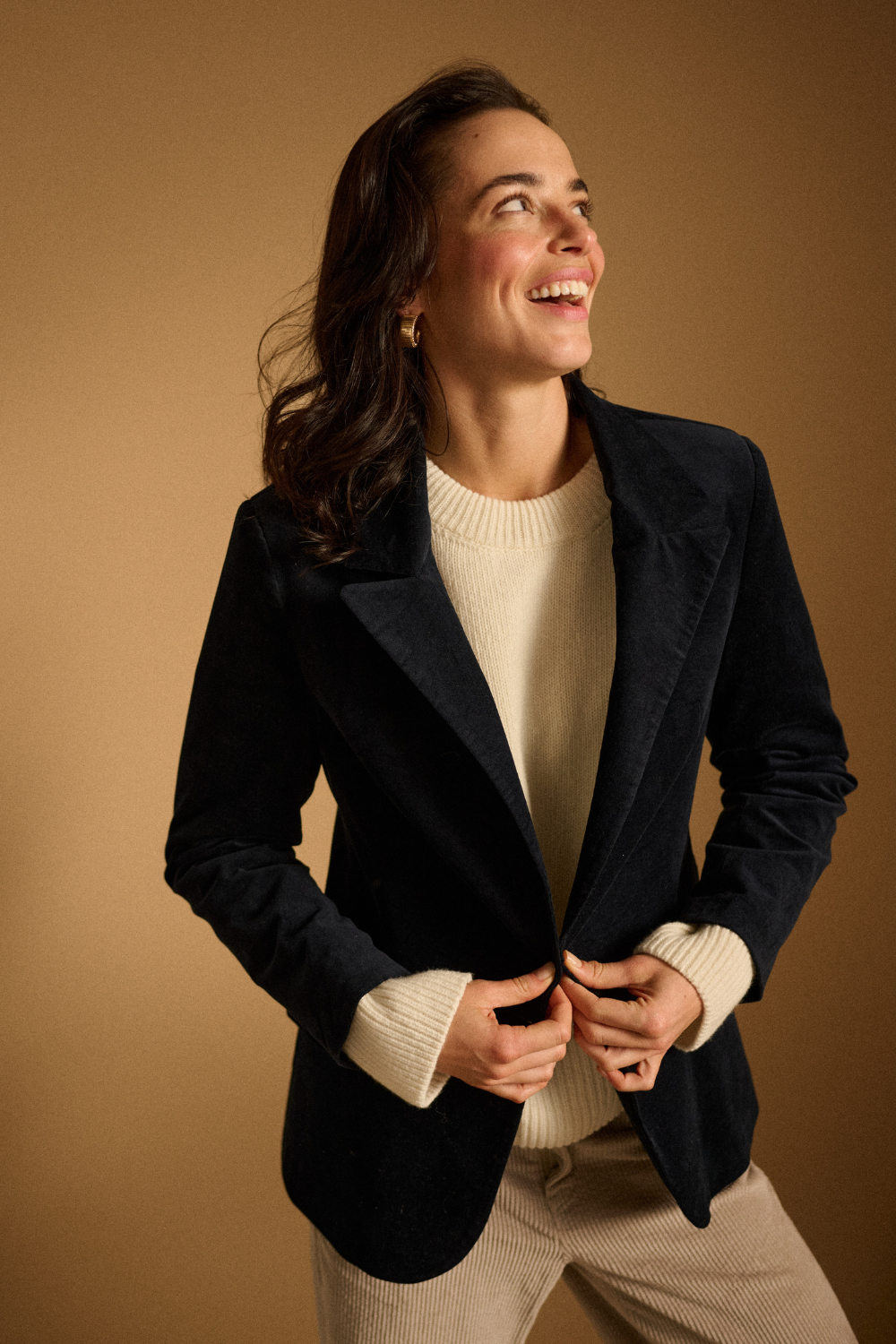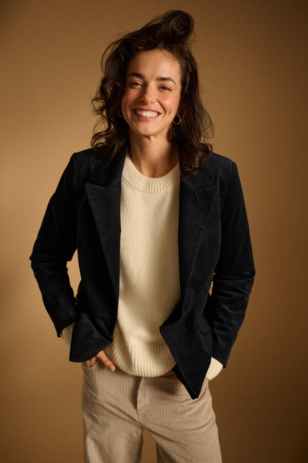 Klasyka w najmodniejszym, vintage’owym wydaniu. Marynarka Velvet to dłuższa marynarka o ponadczasowym kroju, zaprojektowana i uszyta w Polsce z mięsistego, bawełnianego welur. Zapinana na jeden guzik, z kieszeniami, łączy elegancję i wygodę w perfekcyjnej proporcji. Dostępna w dwóch wyjątkowych odcieniach – navy i cherry – doskonale podkreśla styl vintage w najnowszym, współczesnym wydaniu. Załóż ją do swetra, koszuli lub koronkowego topu, by stworzyć look pełen charakteru i subtelnej nostalgii. Model na lata – nie ulegający trendom, zawsze aktualny.