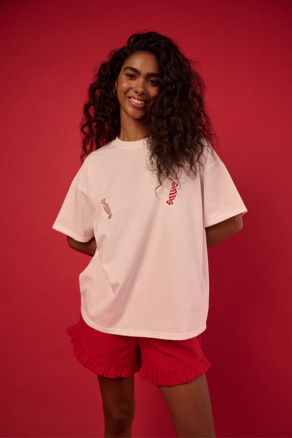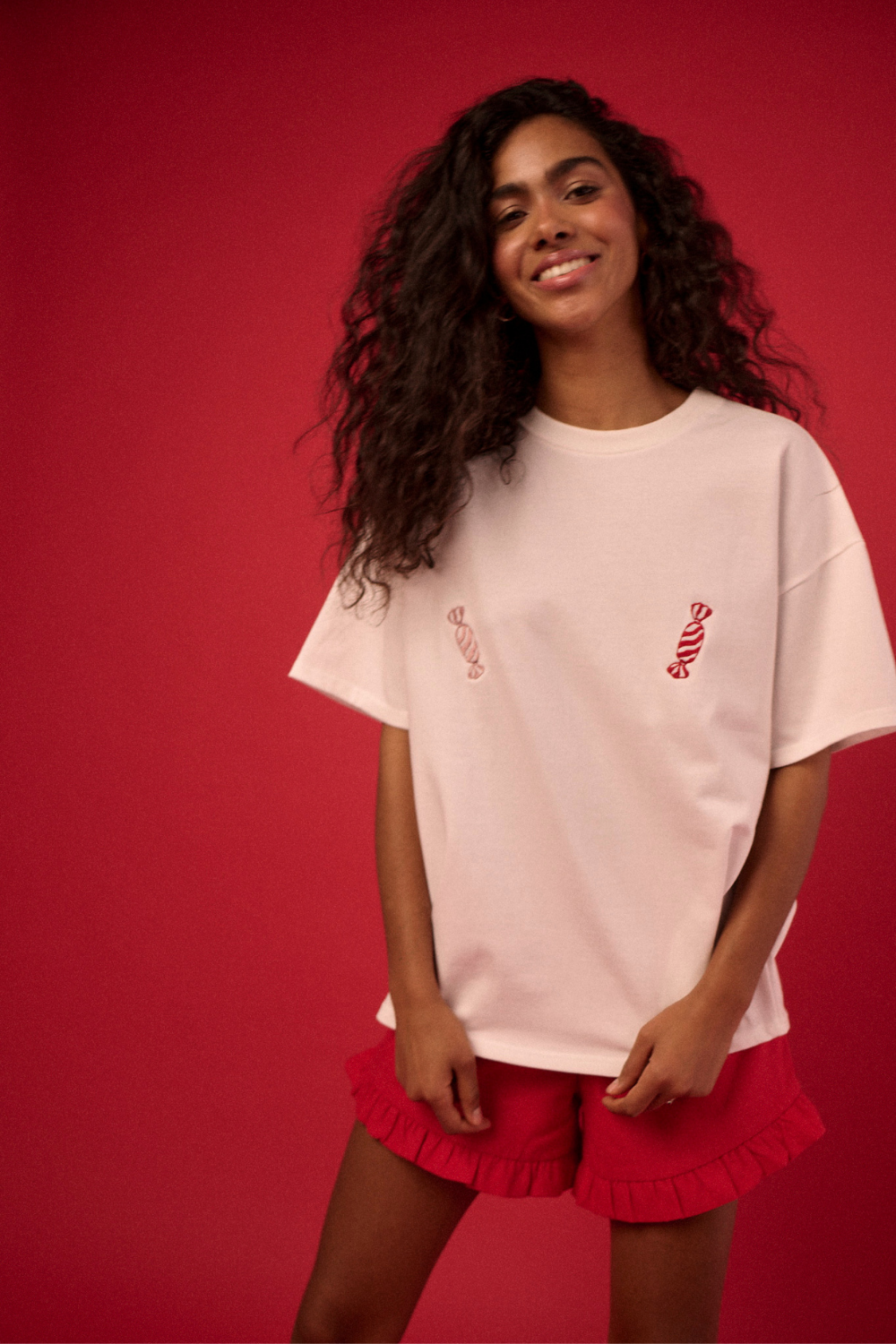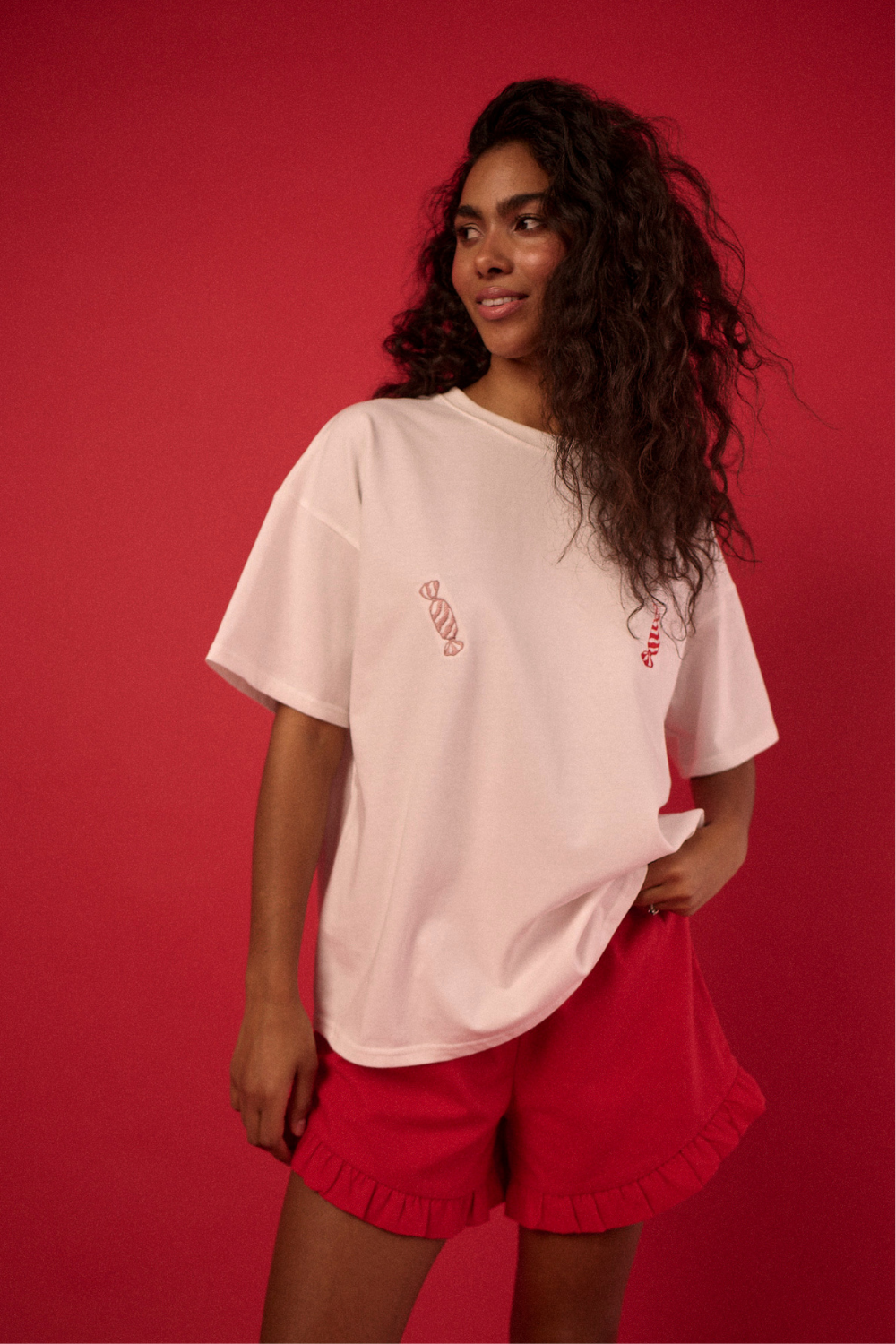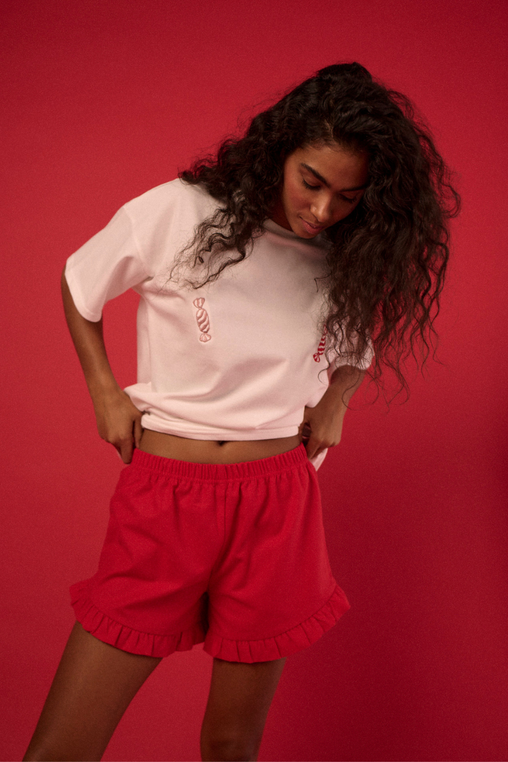 Wskocz w piżamę, która łączy komfort z niepowtarzalnym stylem! W tym wariancie szorty z miękkiej flaneli, wykończone subtelną falbanką, nadają całości lekkości i francuskiej nonszalancji. Do tego oversizowy t-shirt z certyfikowanej bawełny, ozdobiony autorskim haftem cukierków. To idealny zestaw na relaks w domowym zaciszu. Twoje poranki i wieczory jeszcze nigdy nie były tak pełne wygody i stylu. Noś razem lub oddzielnie – bo t-shirt z cuksami świetnie sprawdzi się w stylizacji do jeansów lub sztruksów.