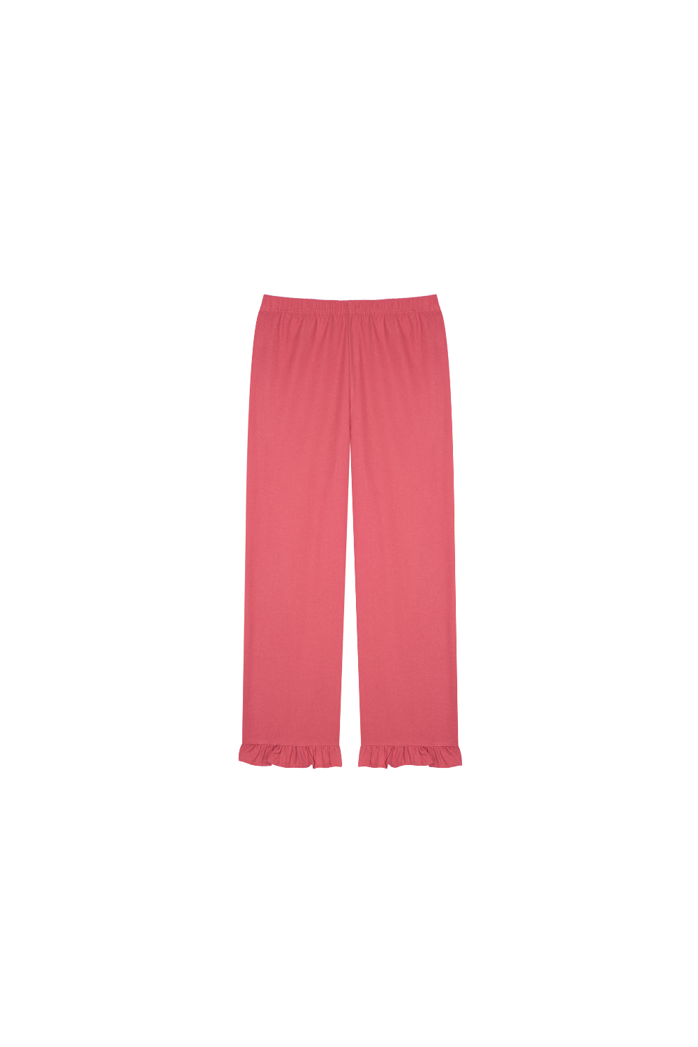 Wskocz w piżamę, która łączy komfort z niepowtarzalnym stylem! Długie spodnie z miękkiej flaneli, wykończone subtelną falbanką, nadają całości lekkości i francuskiej nonszalancji. Do tego oversizowy t-shirt z certyfikowanej bawełny, ozdobiony dwoma subtelnymi bawełnianymi ażurowymi serduszkami. To idealny zestaw na relaks w domowym zaciszu. Twoje poranki i wieczory jeszcze nigdy nie były tak pełne wygody i stylu. Noś razem lub oddzielnie – bo t-shirt z sercami świetnie sprawdzi się w codziennej stylizacji do jeansów lub sztruksów.