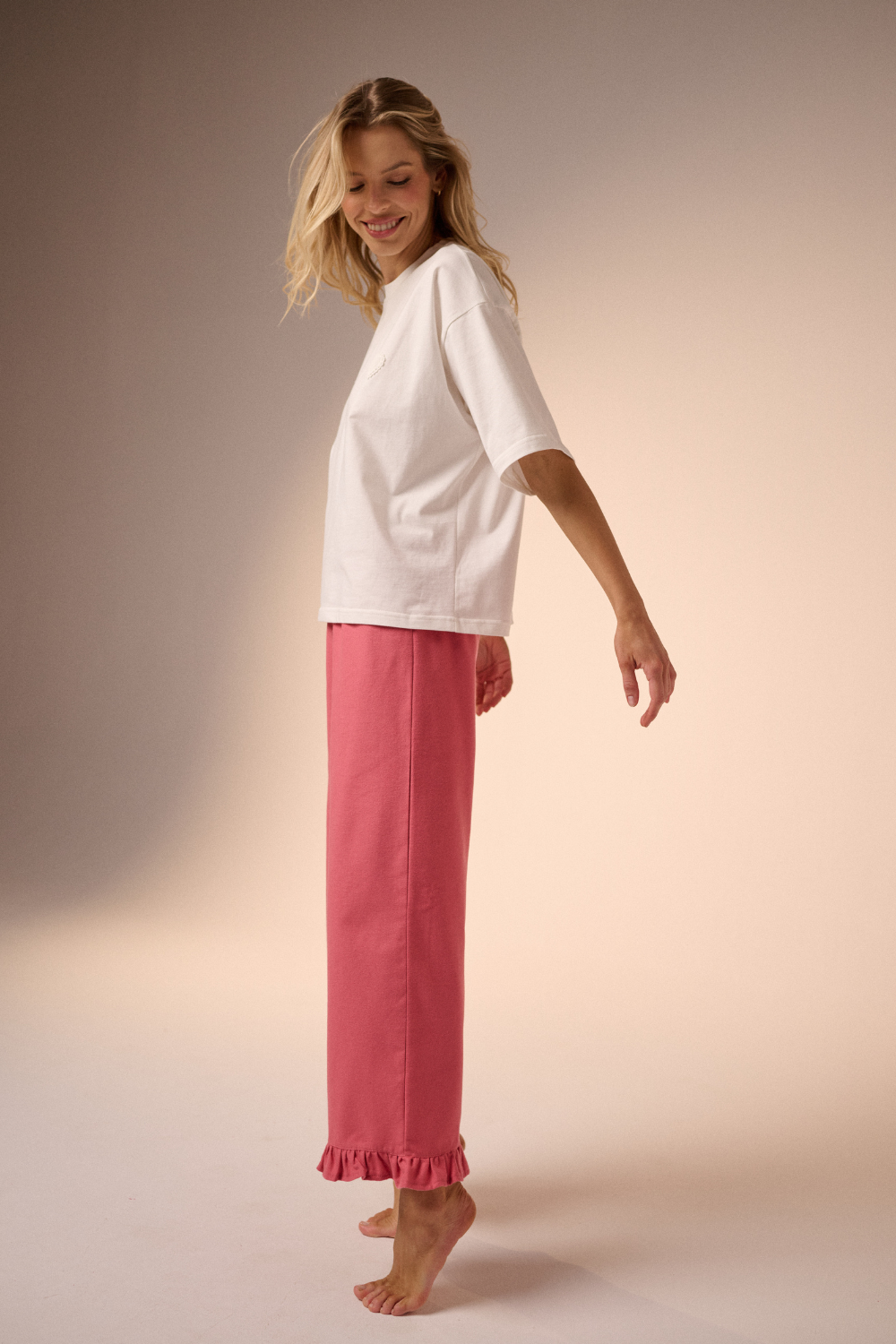 - w zestawie luźne spodnie wykończone falbanką oraz oversizowy bawełniany t-shirt z aplikacją ażurowych serc
