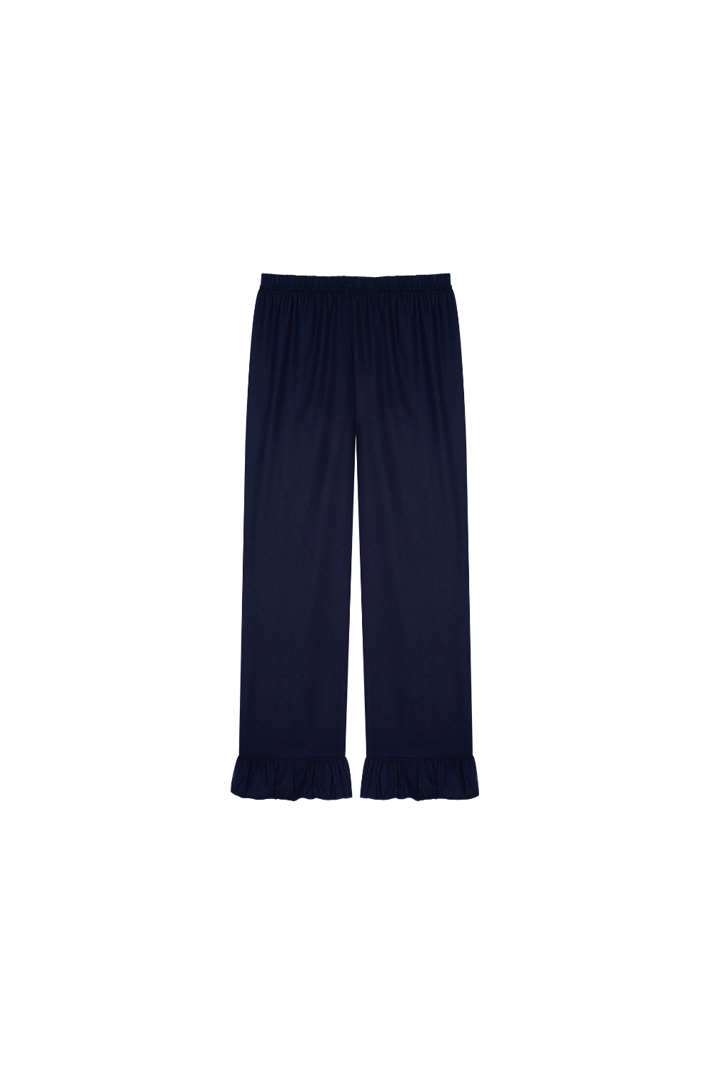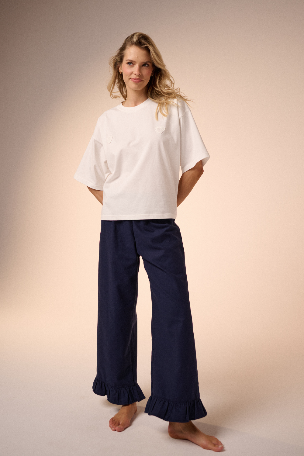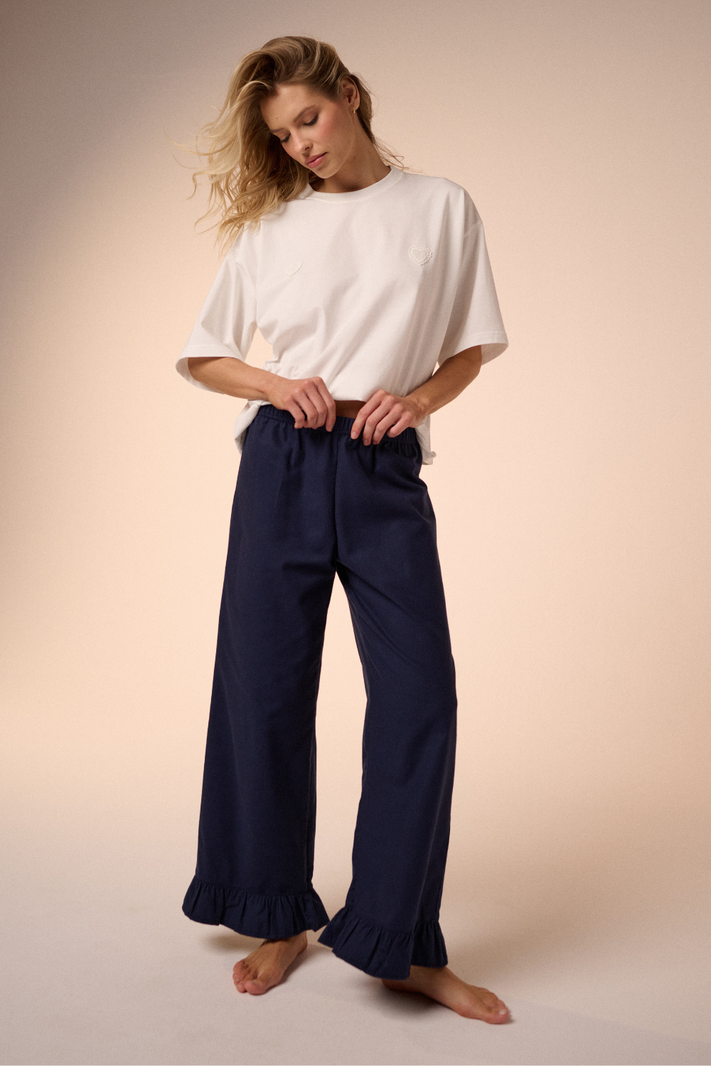 Wskocz w piżamę, która łączy komfort z niepowtarzalnym stylem! Długie spodnie z miękkiej flaneli, wykończone subtelną falbanką, nadają całości lekkości i francuskiej nonszalancji. Do tego oversizowy t-shirt z certyfikowanej bawełny, ozdobiony dwoma subtelnymi bawełnianymi ażurowymi serduszkami. To idealny zestaw na relaks w domowym zaciszu. Twoje poranki i wieczory jeszcze nigdy nie były tak pełne wygody i stylu. Noś razem lub oddzielnie – bo t-shirt z sercami świetnie sprawdzi się w codziennej stylizacji do jeansów lub sztruksów.