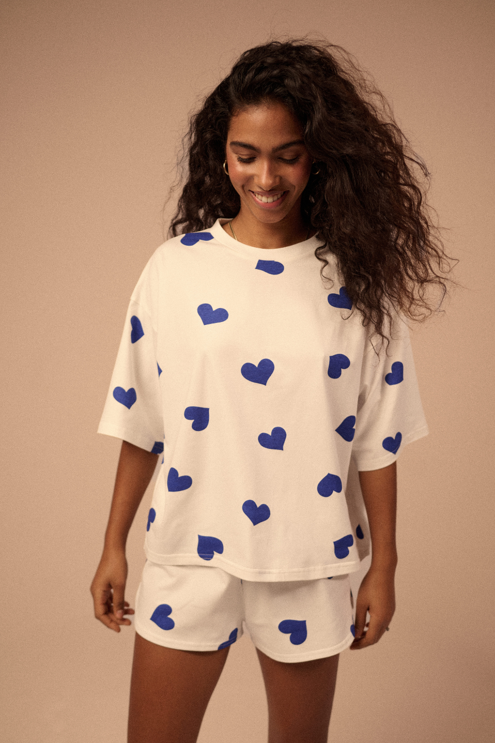 Wasz ulubiony zestaw powraca! Niebieskie serca - print który skradł Wasze serca powraca w limitowanej edycji. Dla przypomnienia: oversizowy t-shirt zapewniający maksymalny komfort w zestawie z szortami, które nadają kobiecości całemu modelowi. Wykonana z certyfikowanej, oddychającej bawełny, jest nie tylko przyjemna w dotyku, ale także przyjazna dla skóry.