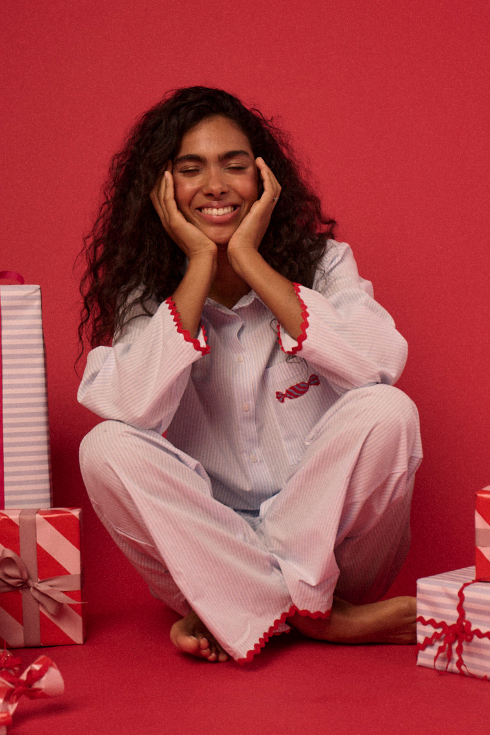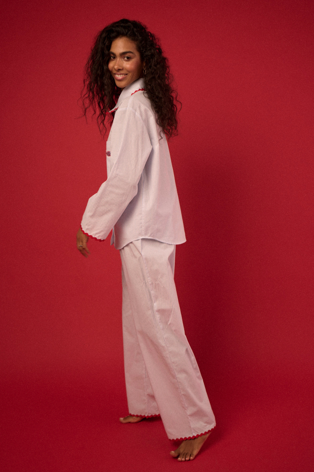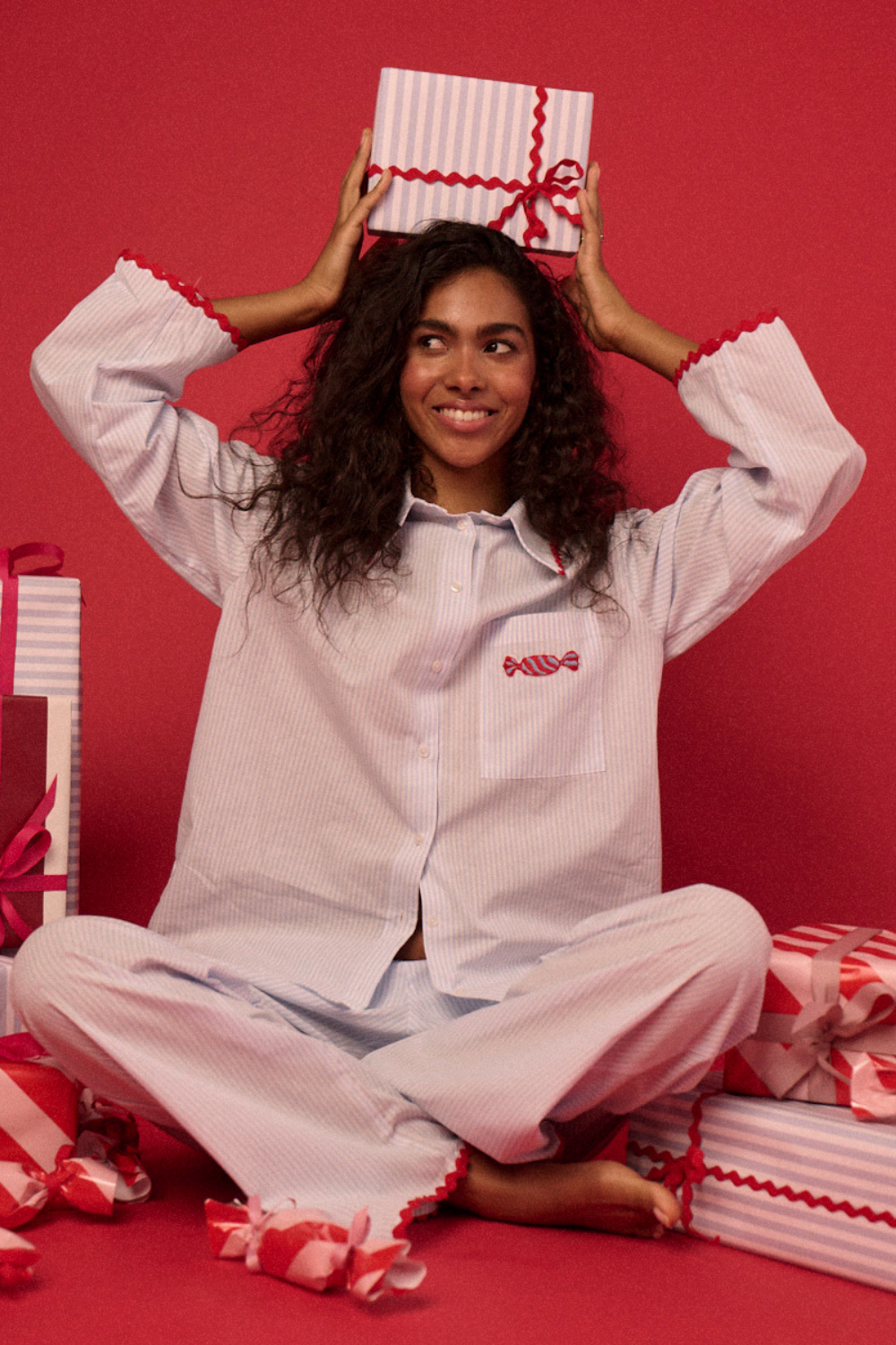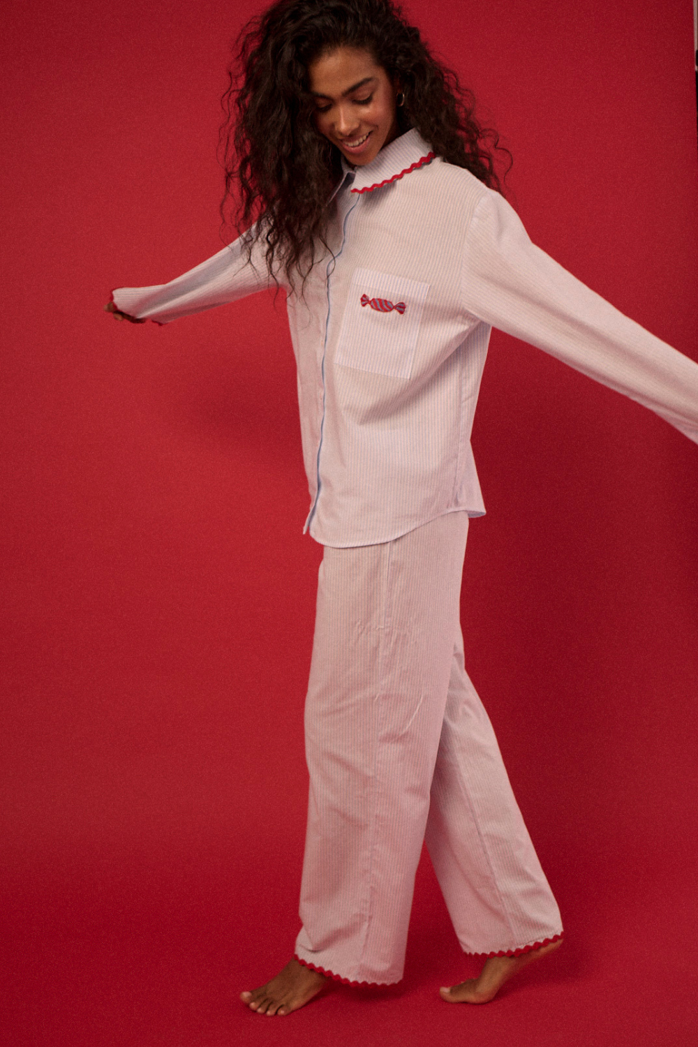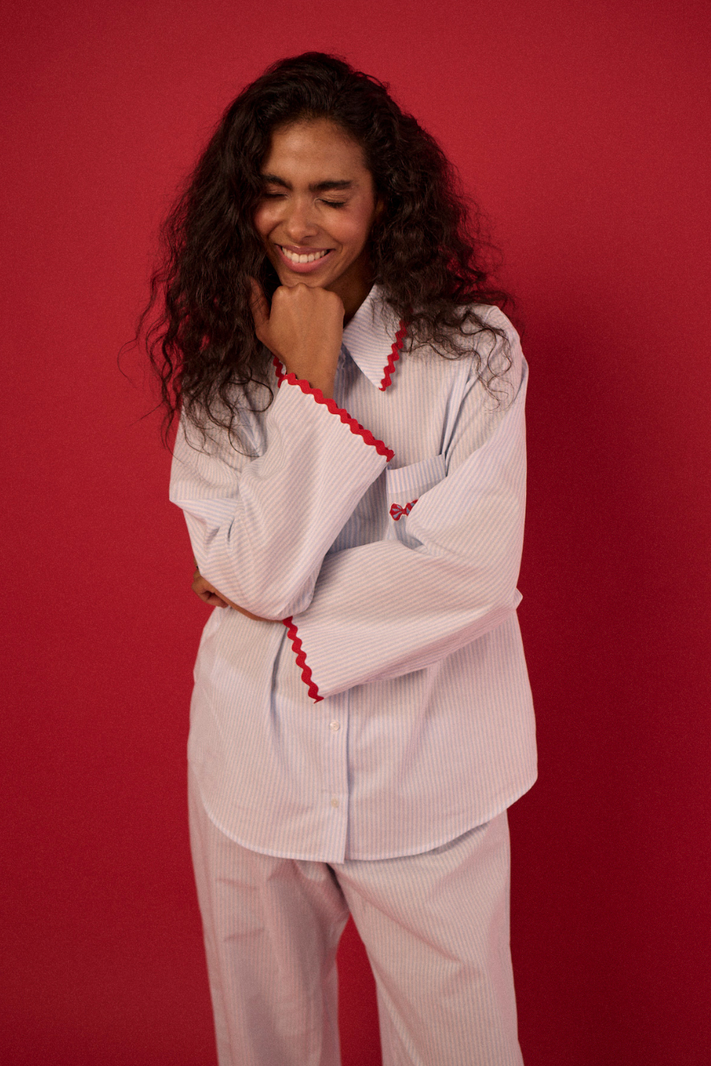 Klasyczna rozpinana koszula, inspirowana tradycyjną koszulą męską, w zestawie z długimi, szerokimi spodniami – to kwintesencja skandynawskiego stylu. Prosty, minimalistyczny design w paski i naturalna tkanina bawełniana 100% czynią ten set niezwykle komfortowym i funkcjonalnym. Elementem wyróżniającym jest wykończenie zygzakiem w kontrastowym czerwonym kolorze oraz haft cukierka na kieszeni. Idealny zarówno jako stylowa piżama, jak i uniwersalny homewear, który doskonale wpisuje się w filozofię hygge. Wyjątkowa harmonia wygody, prostoty i ponadczasowej estetyki sprawia, że ten zestaw to must-have na leniwe poranki i spokojne wieczory. Tip od sleepless: załóż ulubione jeansy, koszulę stripes oraz zarzuć na to sweter i stwórz modowy skandynawski look.