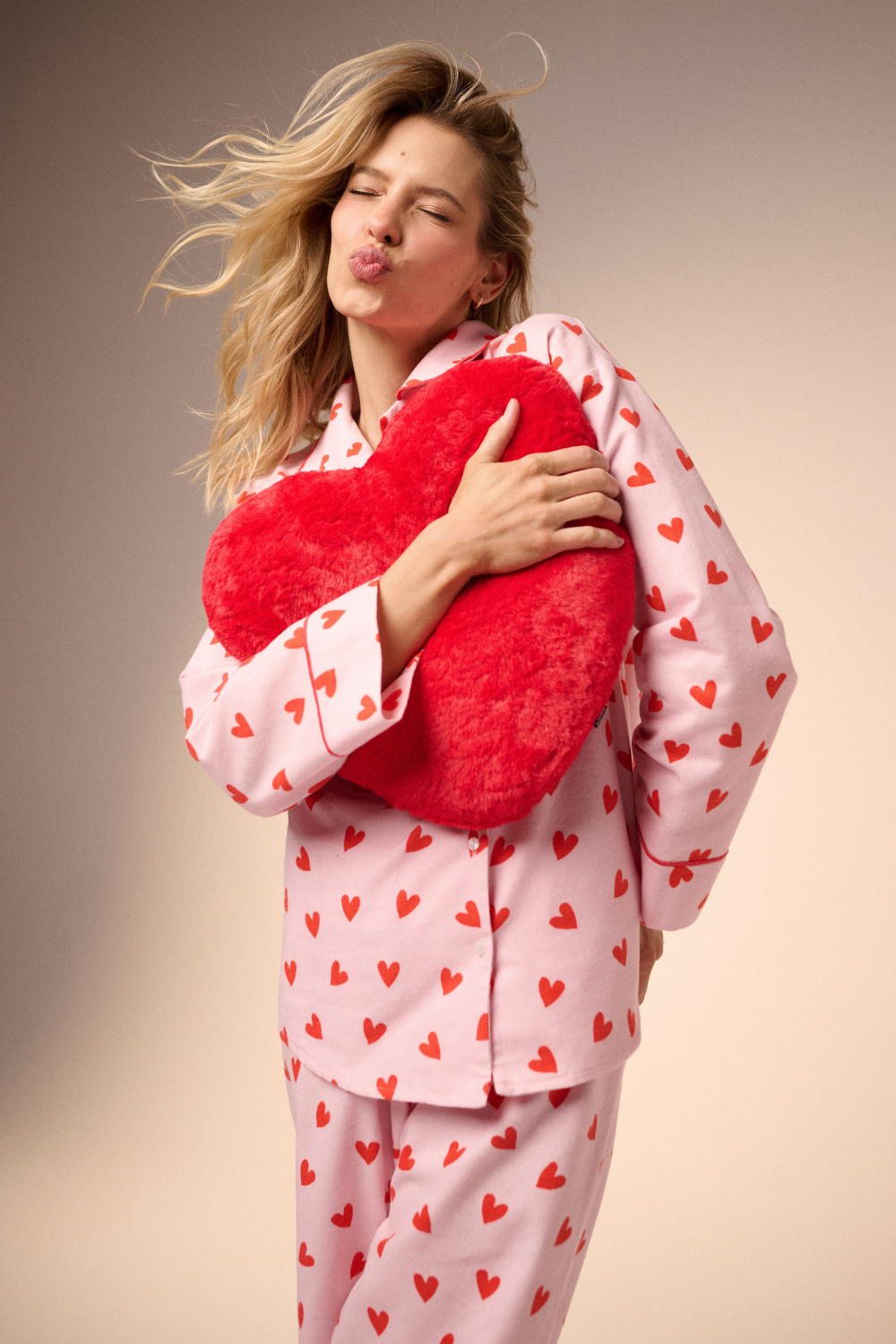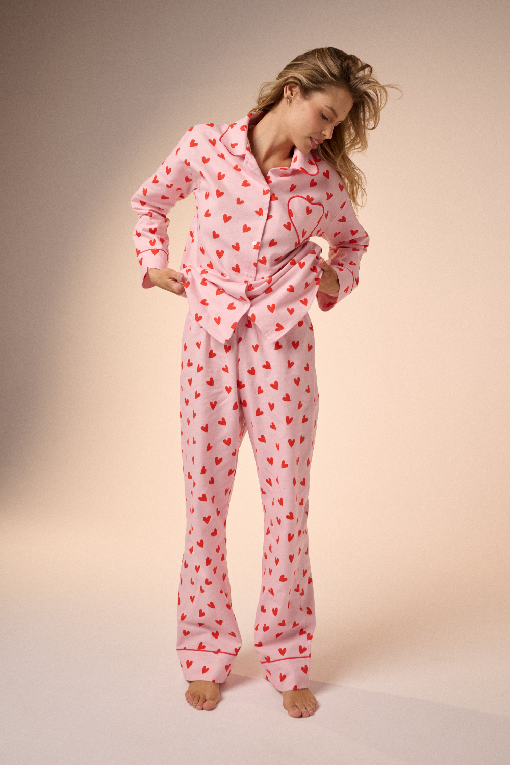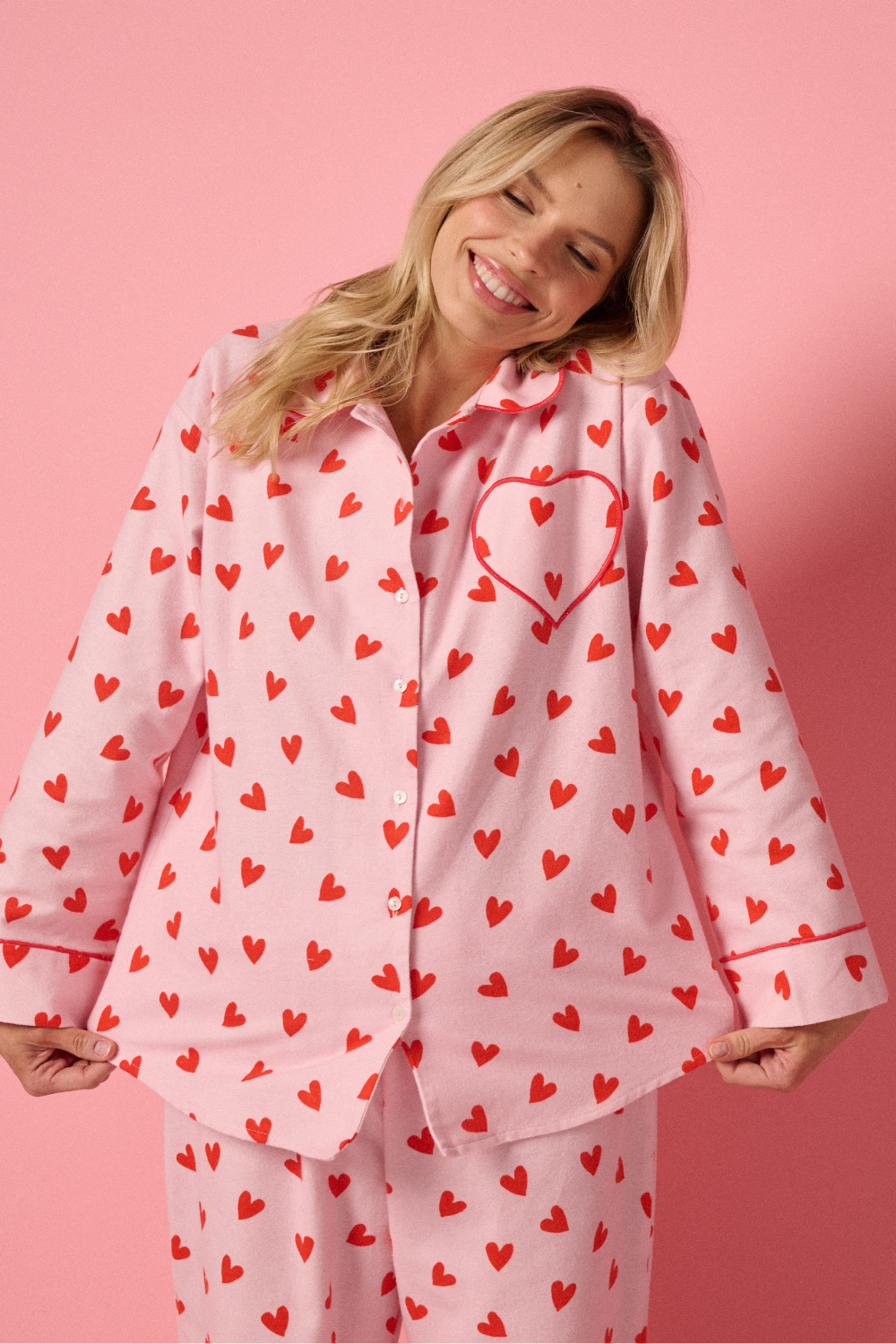Klasyczna rozpinana koszula, inspirowana tradycyjną koszulą męską, w zestawie z długimi, szerokimi spodniami. Wyjątkowy, naturalny set stworzony z miękkiej, mięsistej 100% bawełny szczotkowanej, znanej jako flanela. Komplet wykończony jest kontrastową lamówką, a koszula - kieszonką w kształcie serca. Ultra wygodny, otulający set, który zadba o Twój wypoczynek i piękne sny. * sleepless note: naturalną cechą bawełny jest jej kurczliwość. Weź to pod uwagę dobierając odpowiedni rozmiar.