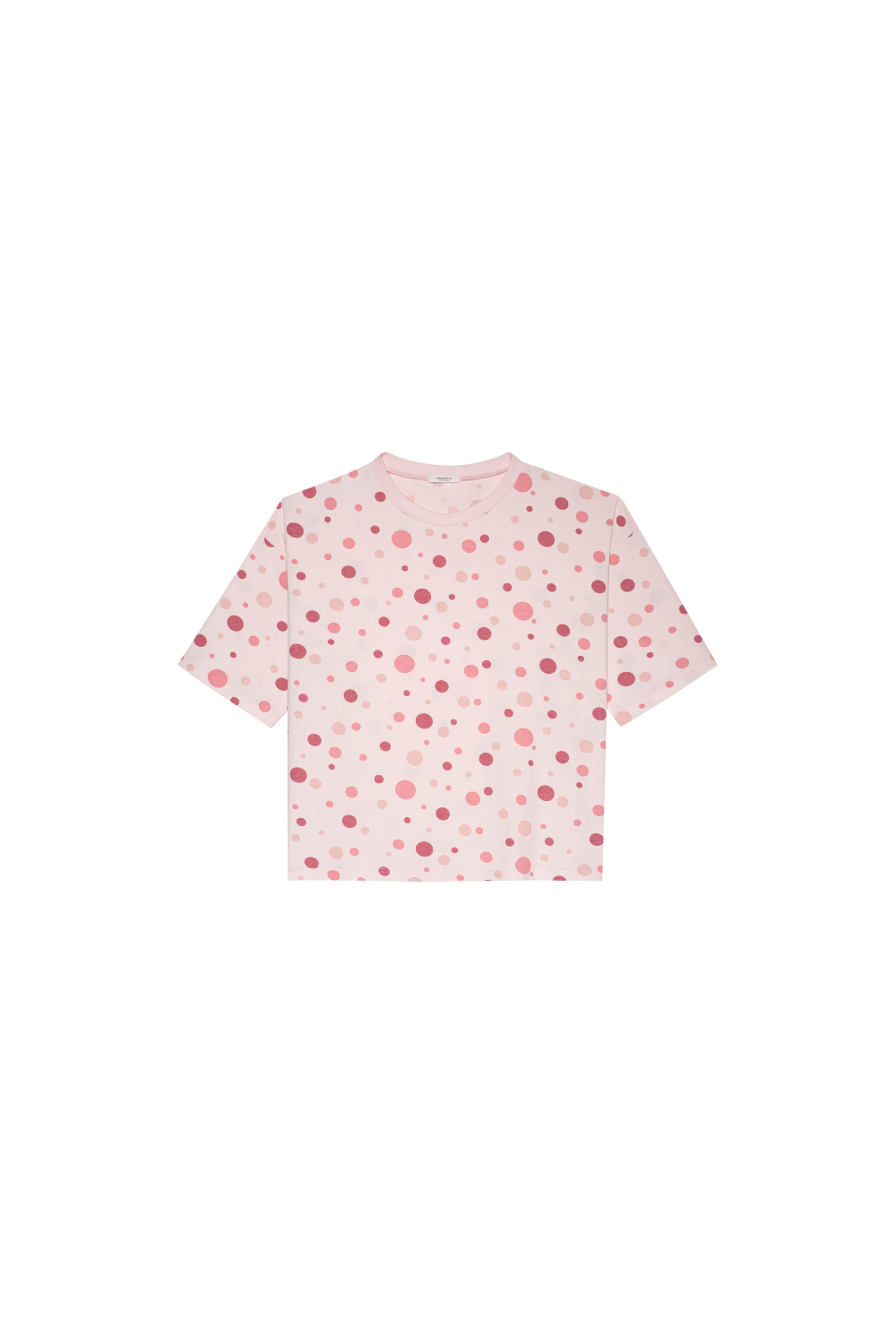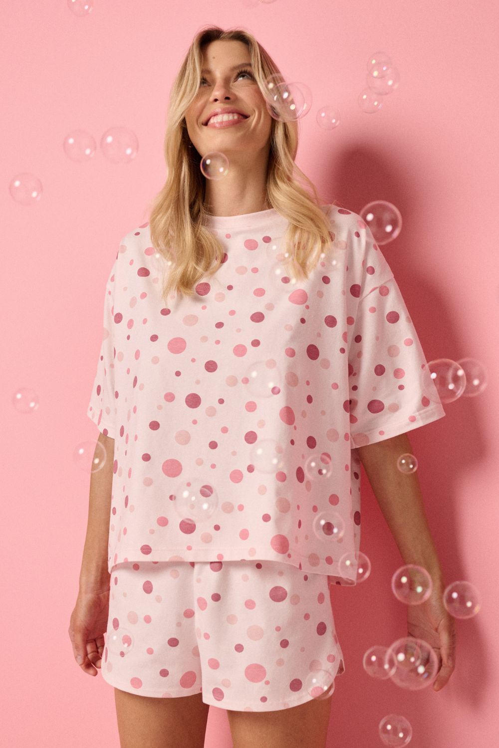 Piżama Bubbles short to oversizowy t-shirt zapewniający maksymalny komfort w zestawie z szortami, które nadają kobiecości całemu modelowi. Wykonana z certyfikowanej, oddychającej bawełny, jest nie tylko przyjemna w dotyku, ale także przyjazna dla skóry.