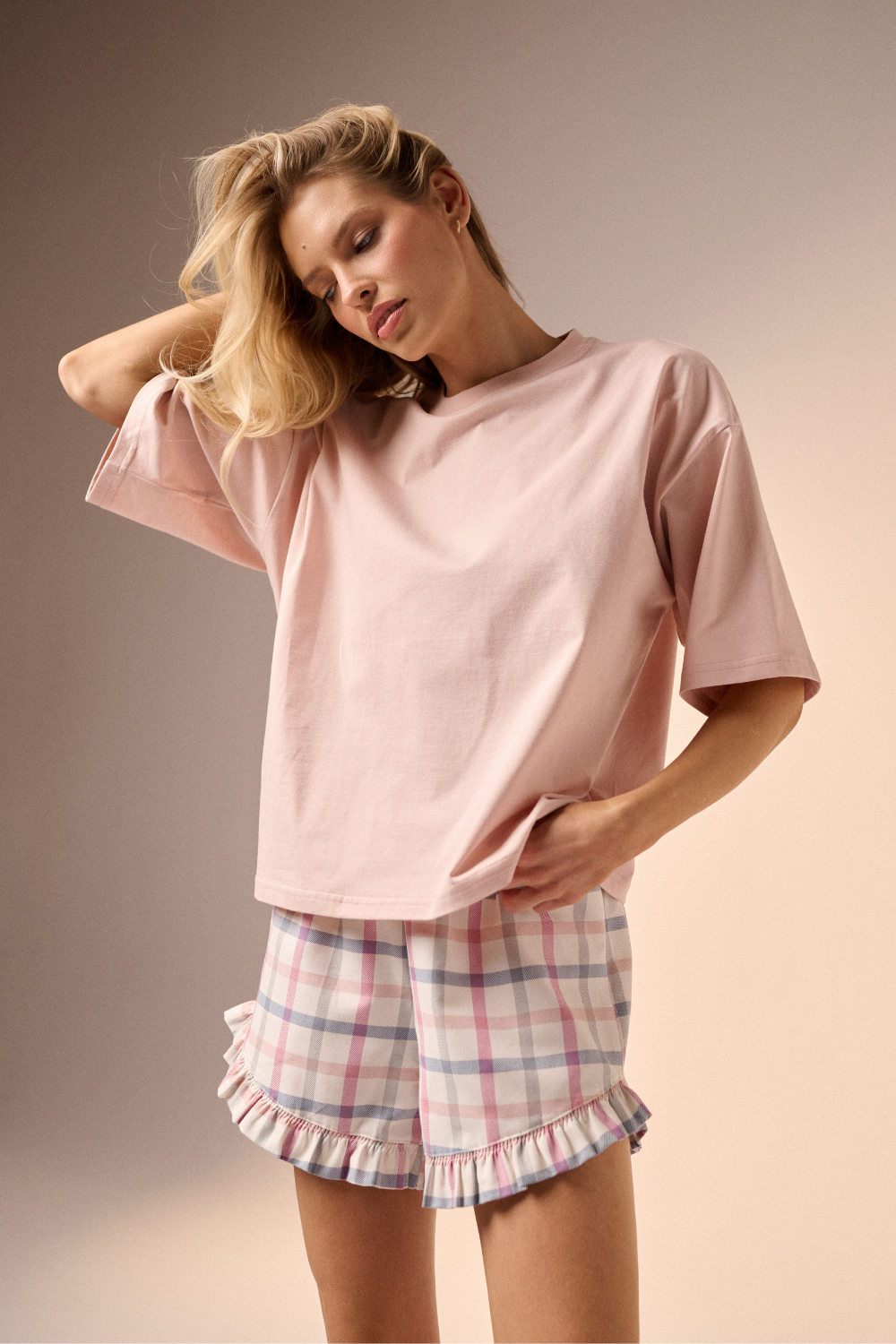 Wskocz w piżamę, która łączy komfort z niepowtarzalnym stylem! W tym wariancie szorty z miękkiej flaneli w kratę, wykończone subtelną falbanką, nadają całości lekkości i francuskiej nonszalancji. Do tego oversizowy t-shirt z certyfikowanej bawełny w pięknym odcieniu baby pink. To idealny zestaw na relaks w domowym zaciszu. Twoje poranki i wieczory jeszcze nigdy nie były tak pełne wygody i stylu. Noś razem lub oddzielnie – bo t-shirt z sercami świetnie sprawdzi się w stylizacji do jeansów lub sztruksów.