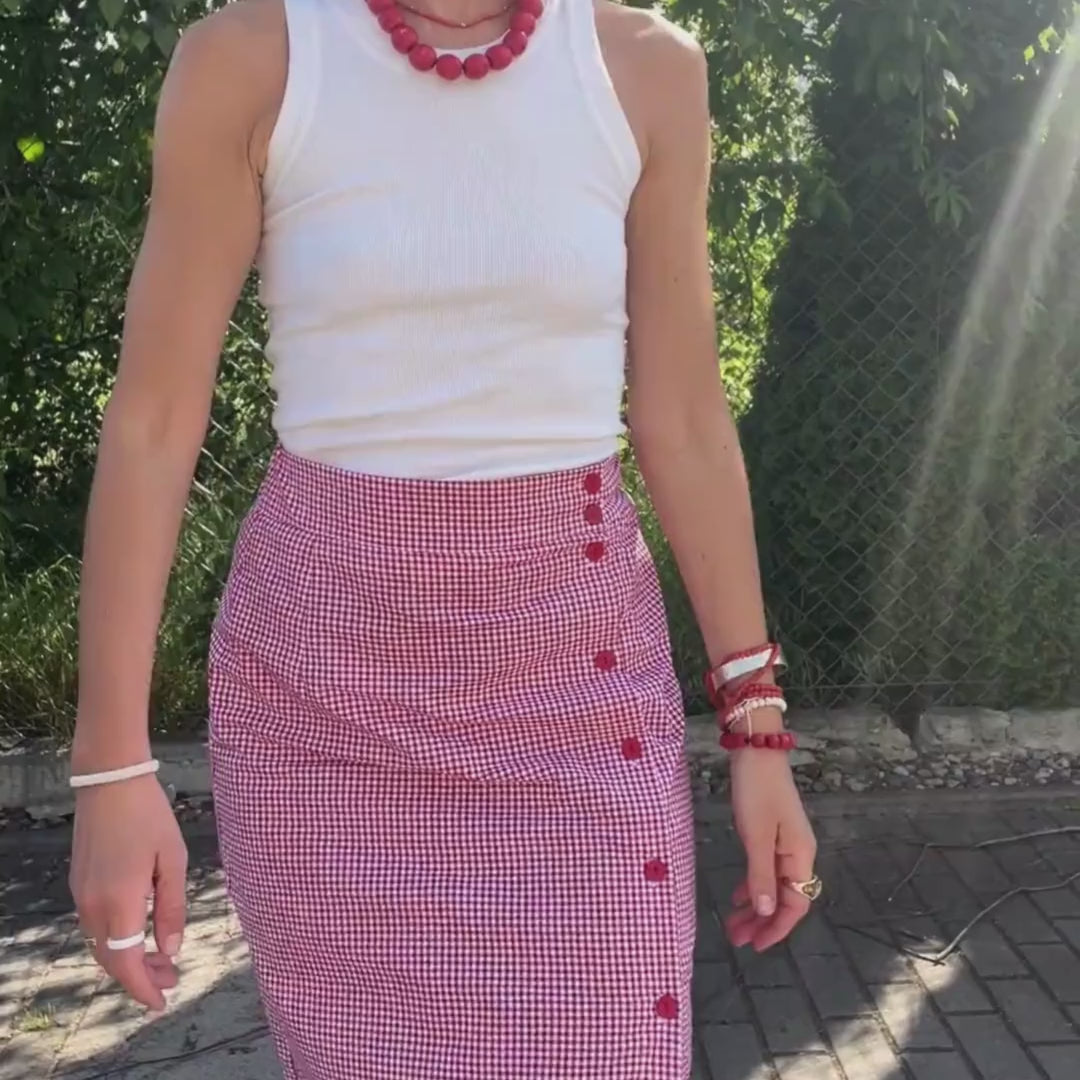 Lucia Rosso to spódnica, która przenosi prosto do słonecznej Sycylii. Jej charakterystyczna biało-czerwona kratka przywodzi na myśl klimat trattorii ukrytych w wąskich uliczkach Palermo. Model o długości za kolano, zapinany jest na guziki, dzięki czemu Ty decydujesz o wielkości rozcięcia eksponującego nogę. Elastyczna gumka z tyłu w pasie zapewnia wygodę i idealne dopasowanie do sylwetki. Dół wykończony falbaną dodaje lekkości ruchu i nuty włoskiej nonszalancji. Spódnica została uszyta z wysokogatunkowej, certyfikowanej bawełny 100%, co gwarantuje komfort noszenia i doskonałą jakość. Stylizuj ją z tanktopem, t-shirtem Caprese Time lub Sardines, aby stworzyć kompletny look w klimacie Dolce Vita Club – pełen koloru, smaku i radości życia.